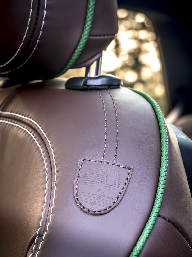 優雅中帶有年輕的車室座艙,透過LED氣氛燈條來迎合各種駕駛者想要風格,進步增強了獨特的特殊饗宴。內裝以黑色可可咖啡色的MINI Yours皮革,搭配上白色強烈對比色車縫線,車縫線包含方向盤與部分門飾版皮件,這些都是Cooper S六十週年專屬設計。最後駕駛者能在車內發現六十週年專屬標誌,在方向盤、座椅等地方印上專屬字樣。