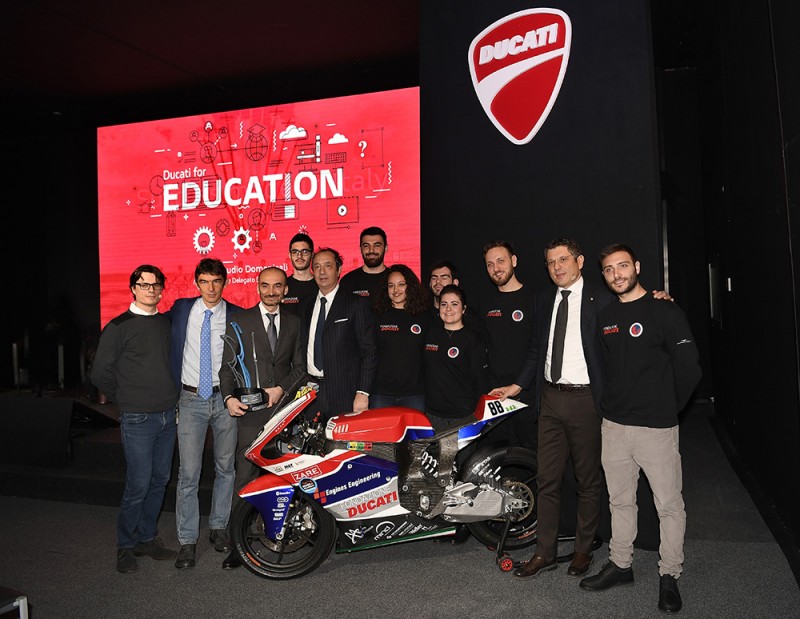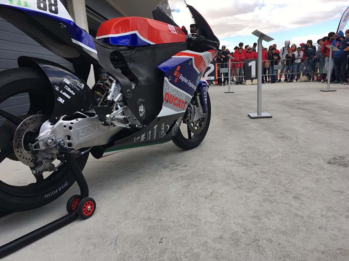 目前DUCATI也積極投入資源在電動車相關的開發與設計上,其中最吸睛的莫過於這台由DUCATI故鄉的Bologna大學學生團隊所開發設計的電動仿賽車款,這台由DUCATI資助製造出來的學生作品,更在Bologna大學的工程競賽中獲得了第三名。