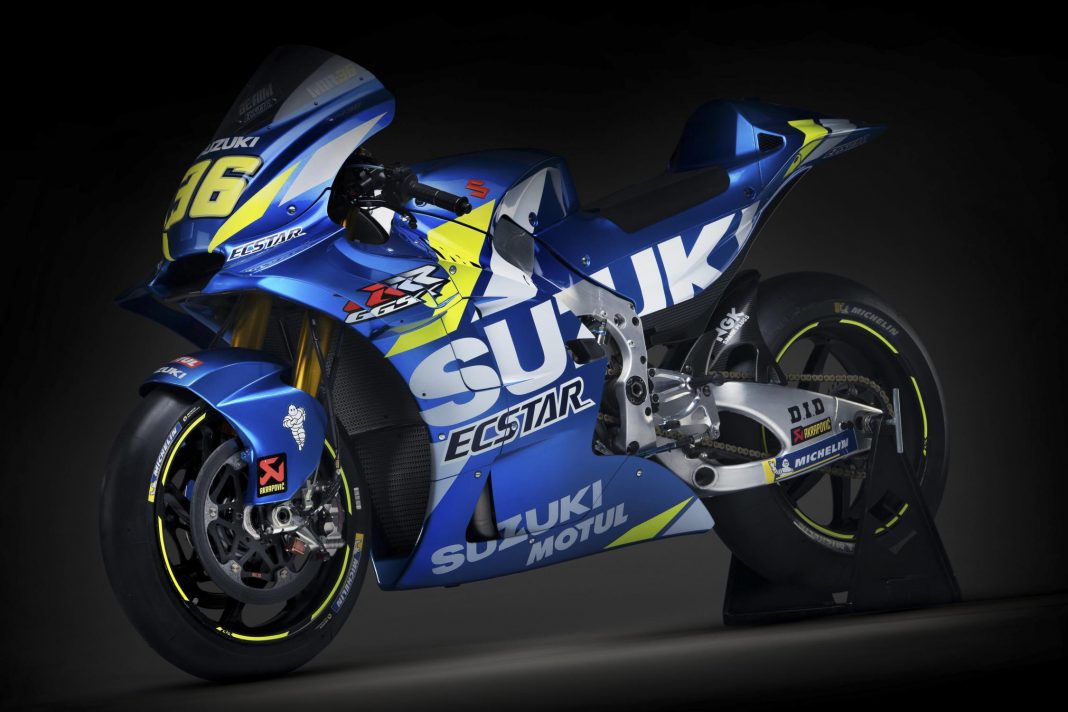 新的SUZUKI GSX-RR賽車塗裝依然維持著天空藍以及黃、白色的顯眼設計,雖然與前幾代的塗裝相去不大,但基調上依然時亮麗且燦爛的。