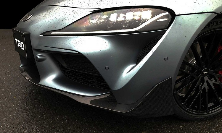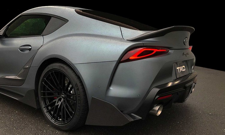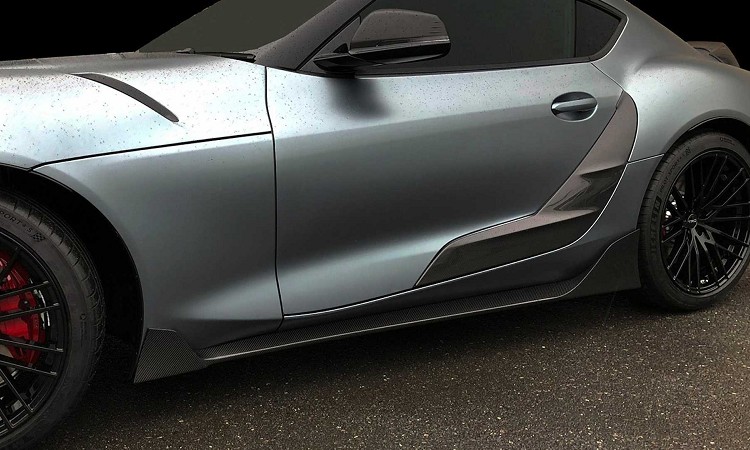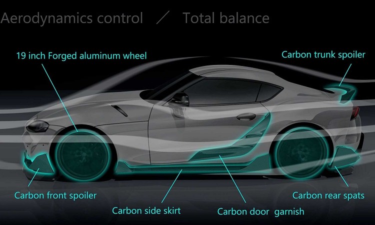 在前臉部分,TRD給予新的Supra一個非常大面積的碳纖維前擾流板,以增加下壓力並提升高速時的前輪抓地力帶來穩定性。側裙也是如此設定,同樣碳纖維材質讓車身重心看起來更低,搭配上門飾板相同樣貌點綴,氣流可穩定的通過車身側邊來到車尾,一切的一切都是讓Supra有更好的氣流通過性來達到高穩定性。