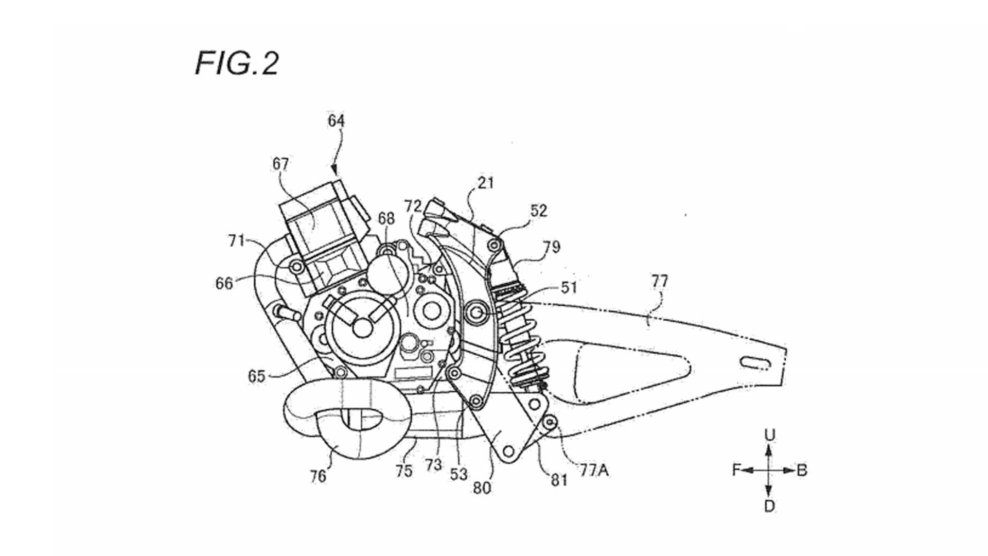 首先看到的專利與引擎位置有關,引擎位置?不就在油箱下方?但是SUZUKI在專利圖上扭轉了引擎擺放的方向,由目前我們常見與地面垂直方向改為較為平躺的設計,幾乎與主車架平行,曲軸被移到引擎後方放置,缸頭位置則相當接近前叉頂部,值得注意的是變速箱下移到引擎正下方,排氣頭段也朝向正下方,並沿著車身下緣向車尾引導。