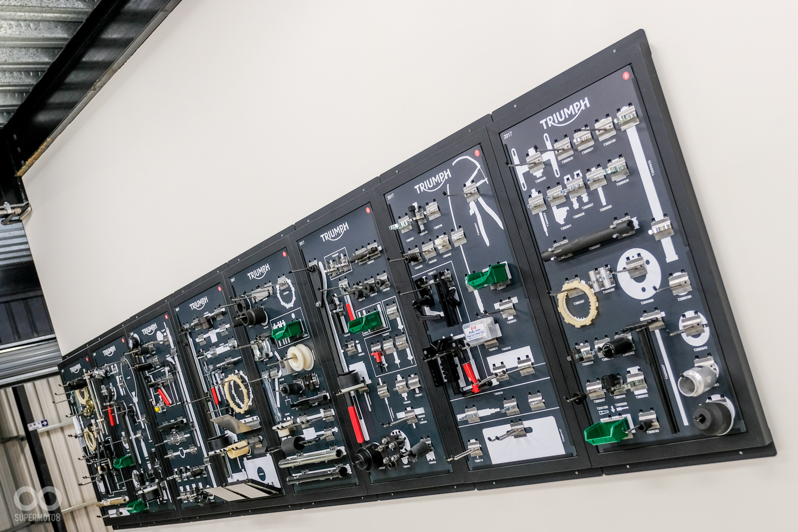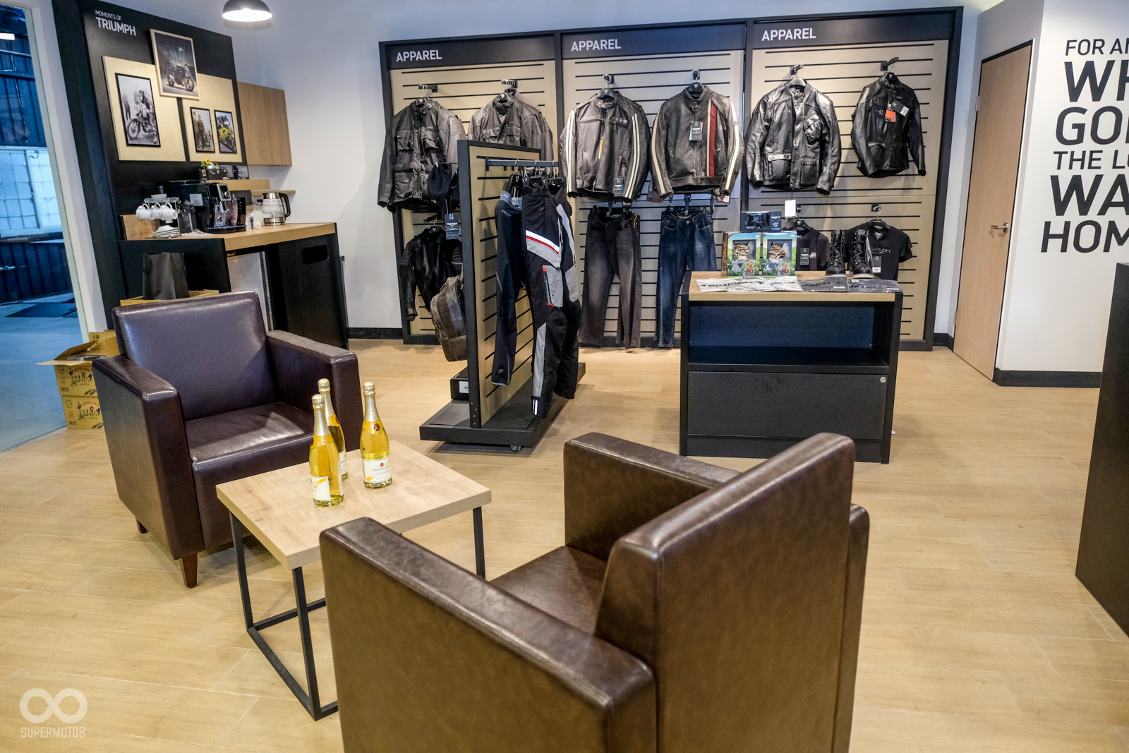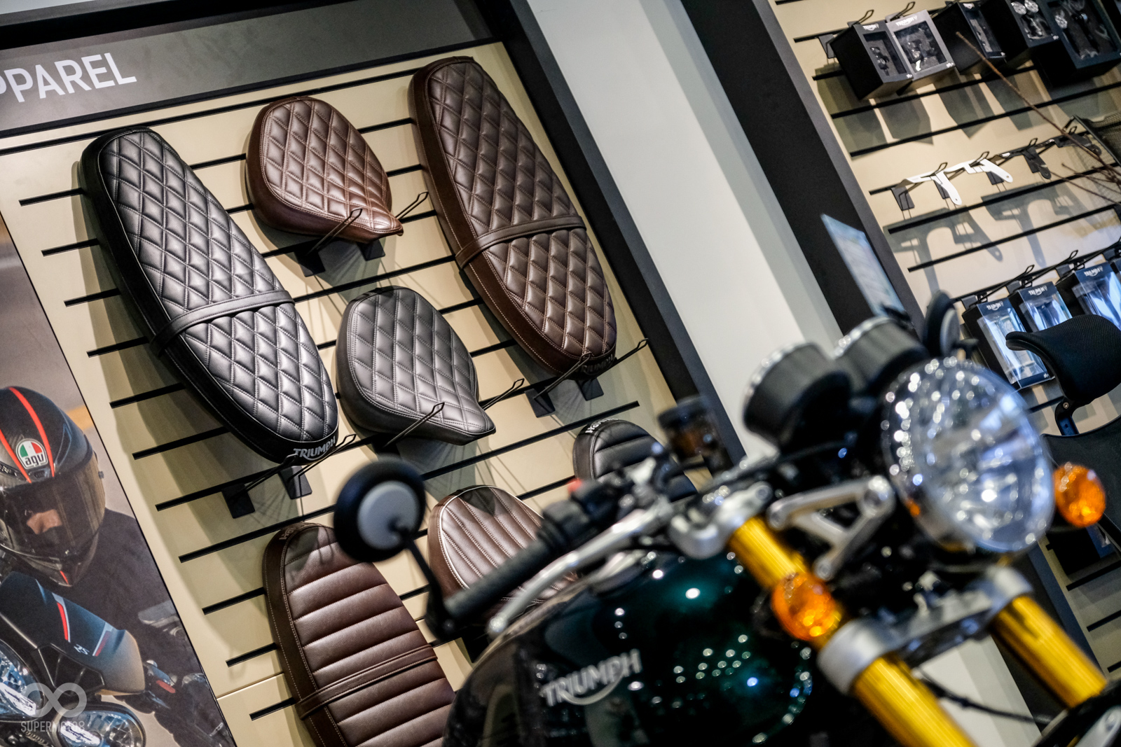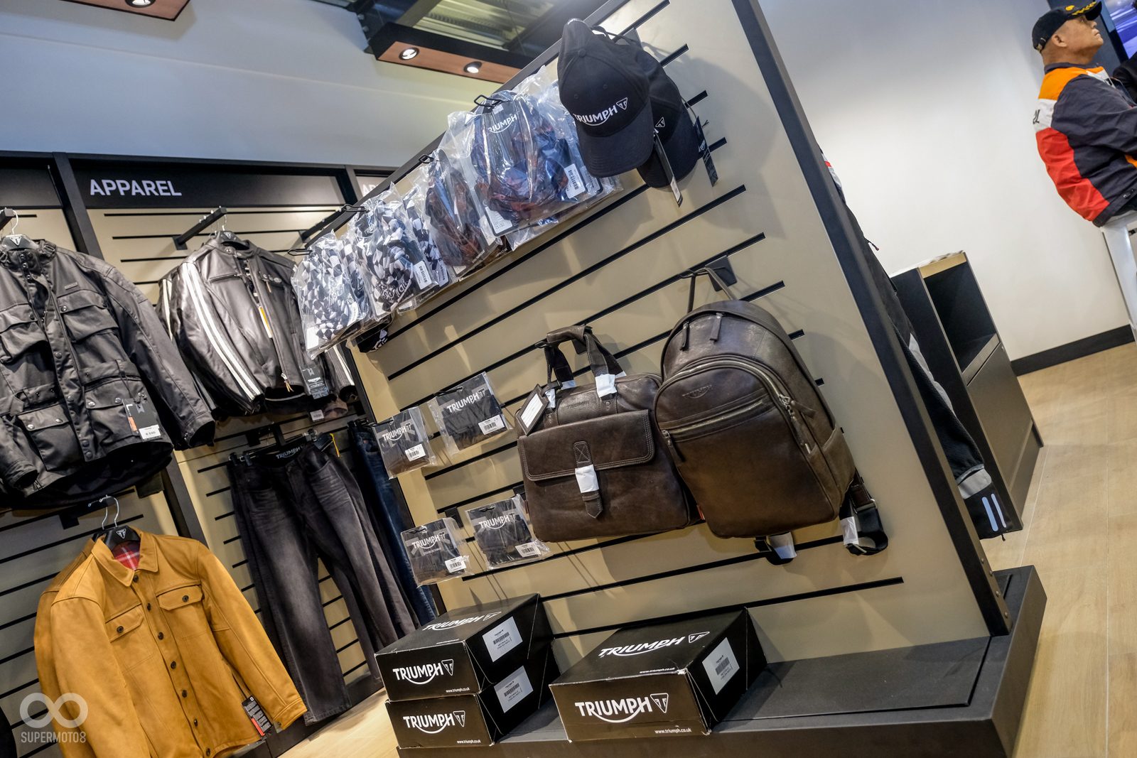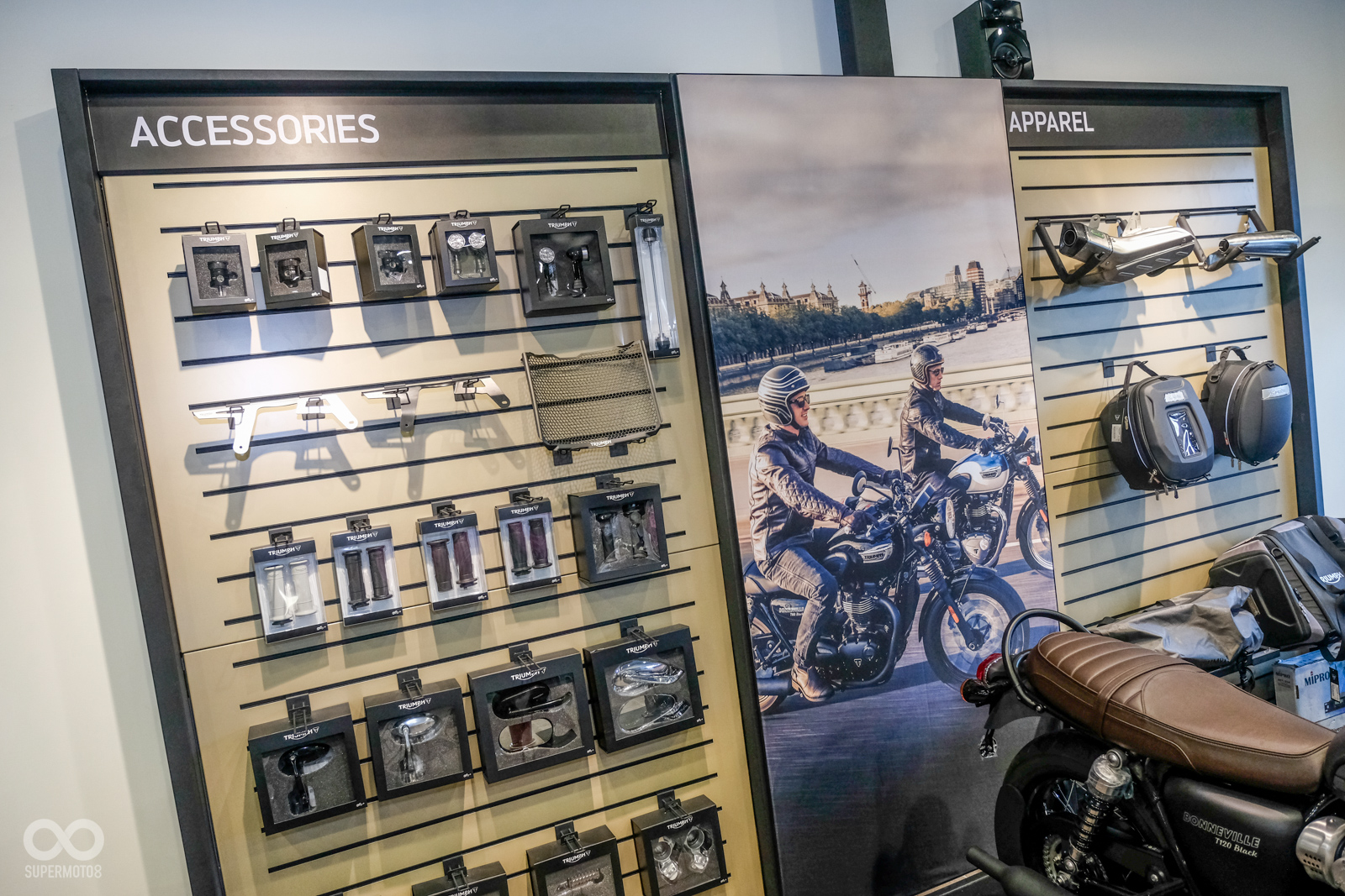 展間內部相當明亮,寬敞,挑高的天花板營造出絕佳的空間感,重要的是內部陳列了齊全的TRIUMPH旗下各車系,寬廣的室內空間讓賞車時不覺得拘束。在展示間的牆面上陳列了豐富的原廠精選配件,原廠推出的改裝配件除了品質具有保障外,造型也經過精心設計,讓配件上車時不顯得格外突兀。