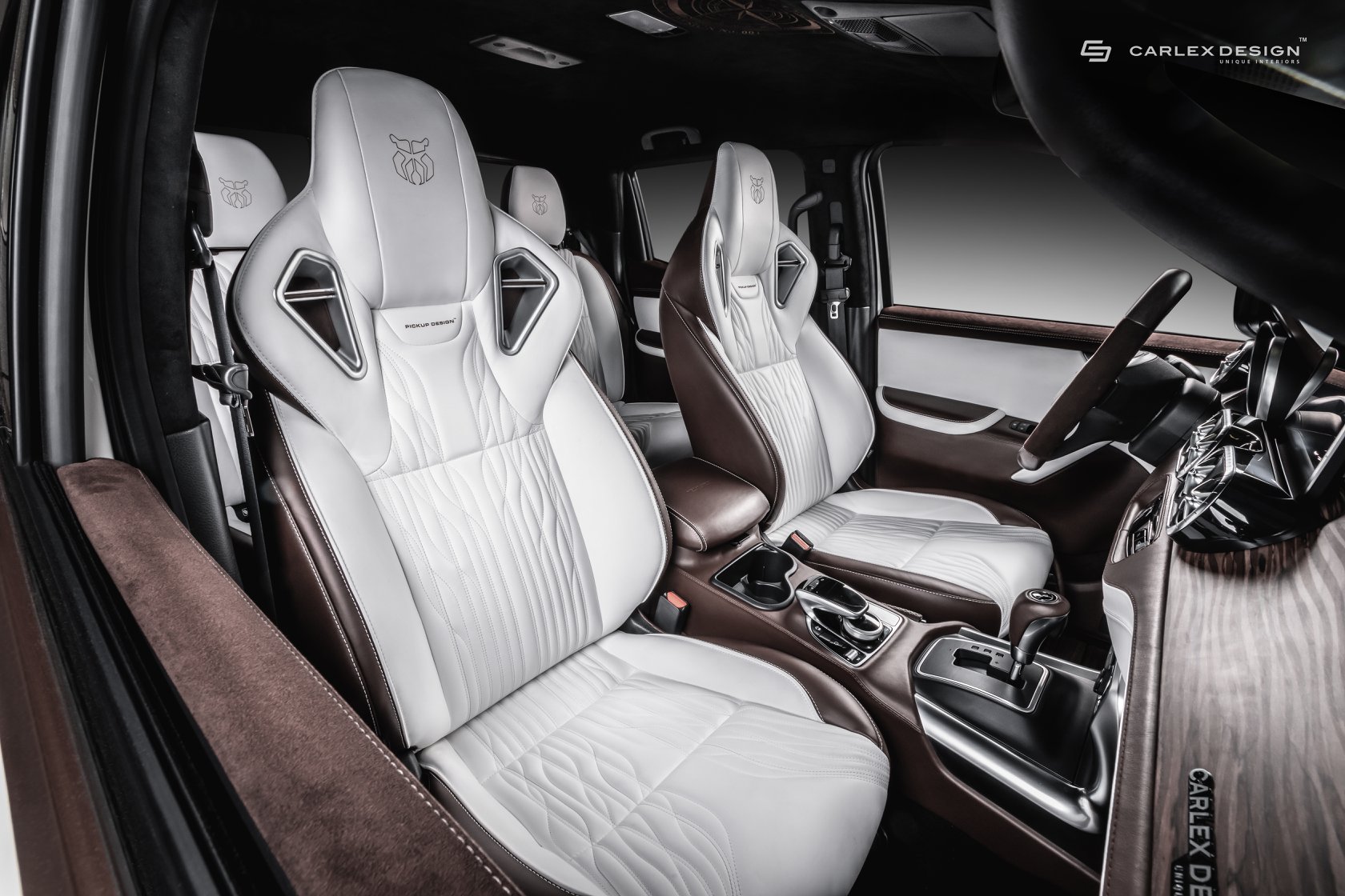 主要色調採棕色與白色,棕色除了原木飾板之外,還有棕色麂皮包覆中控台、門板與方向盤。在大面積的棕色下,刻意用反差極大的白色作為對比顏色,兩種顏色結合後散發出獨到的特殊氛圍,如果不說你坐在貨卡裡面,會以為是在哪輛豪車內。前座座椅換上兩張賽車椅,包覆性提升帶來絕佳支撐性;配合車內顏色,腳墊同樣是棕色系為主,並大膽採用實木作為材質,顛覆大家對於貨卡想像。