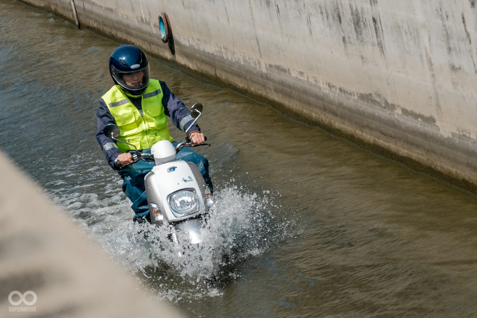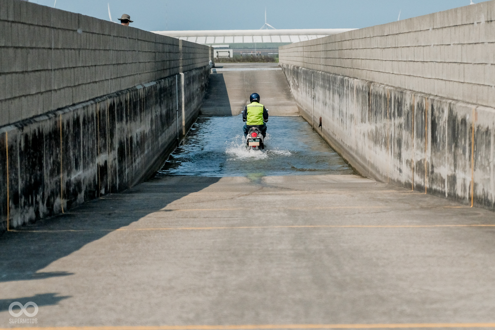 其中的涉水測試,我們將畫面再次拉回ARTC的試車場中,透過水深10cm,來回行駛超過500m,且須保持時速20km/h以上,由穿著連身防水「絕緣」防護衣的試車手下場實測。結束檢測後須用儀器量測車輛是否漏電,確保電動機車的馬達與電池安全。