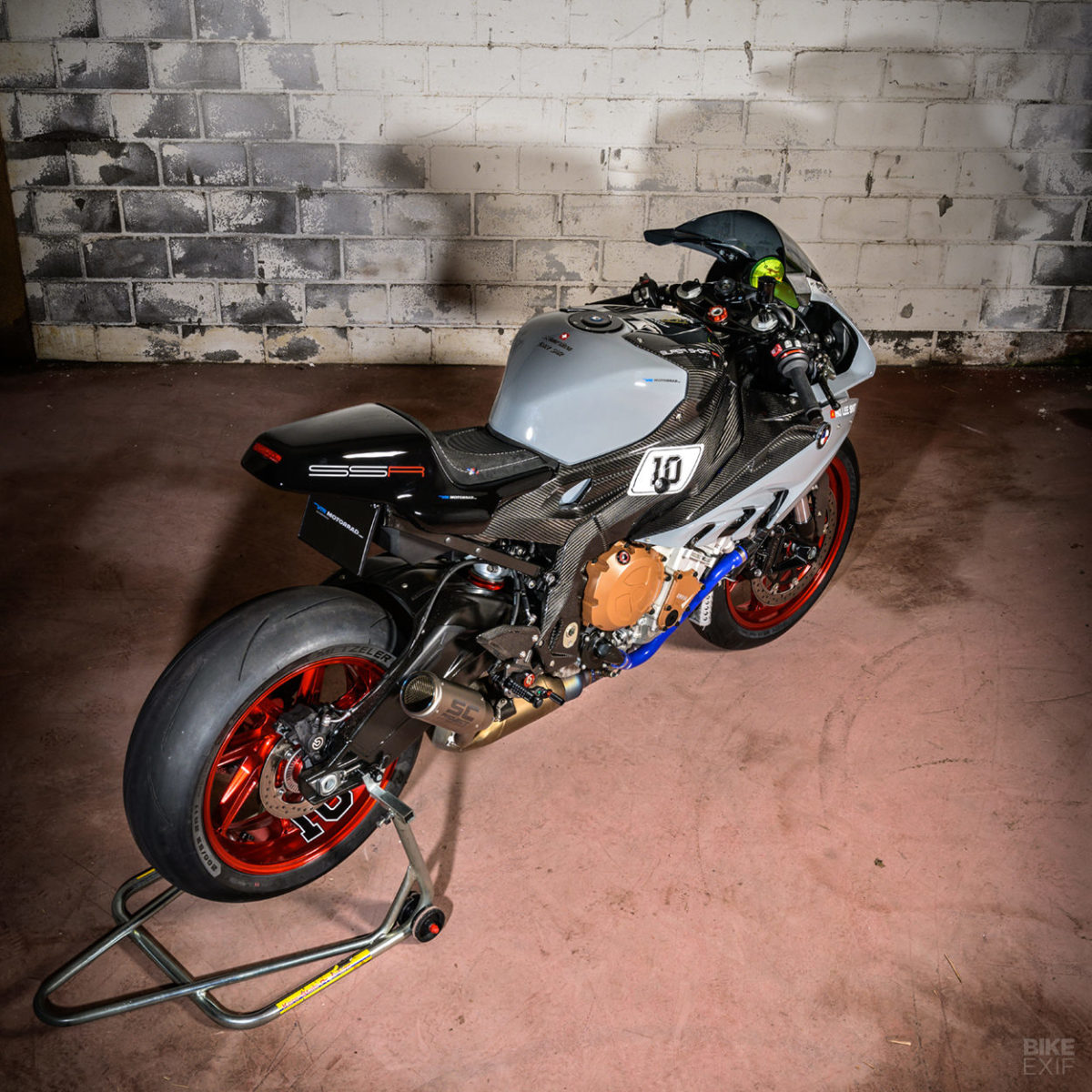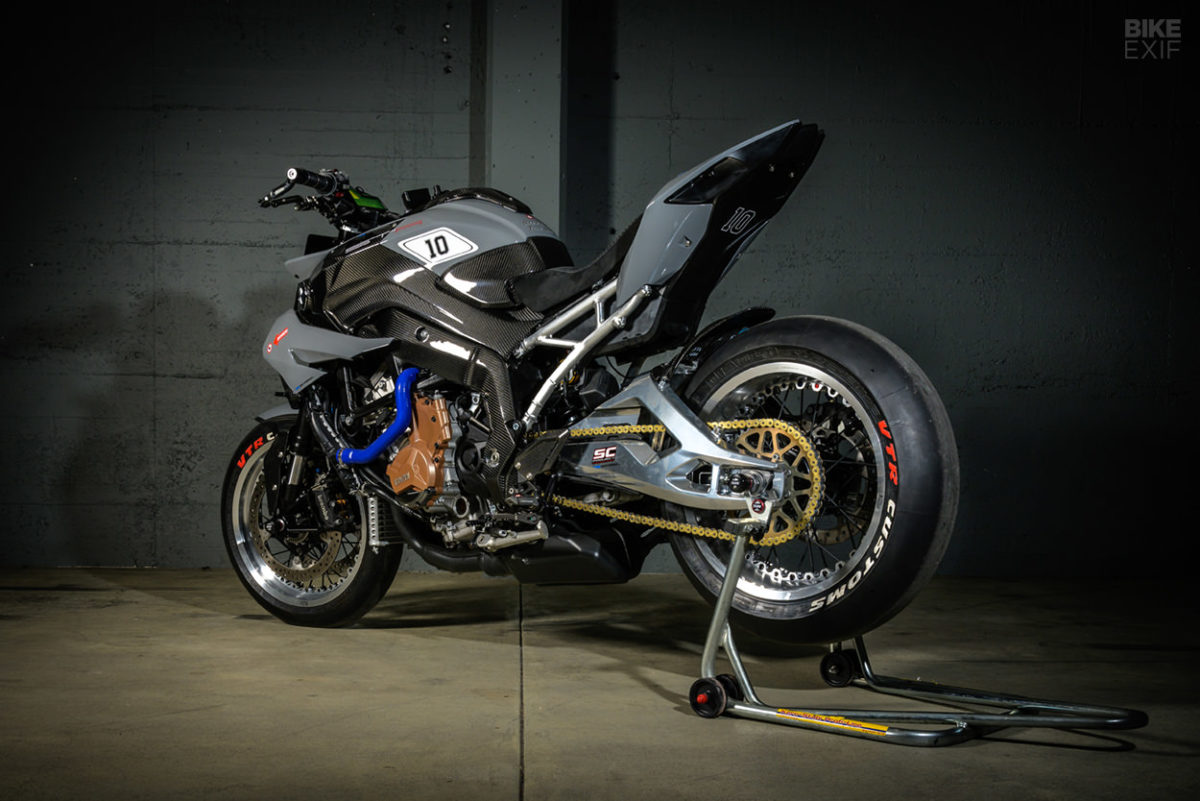 另外一側的BMW S1000RR SSR10,VTR選擇了不同的改法。多數的靈感來自於美國SuperSport:Semi-Faring的半整流罩設計再搭配一組短的恰到好處的車體尾部。