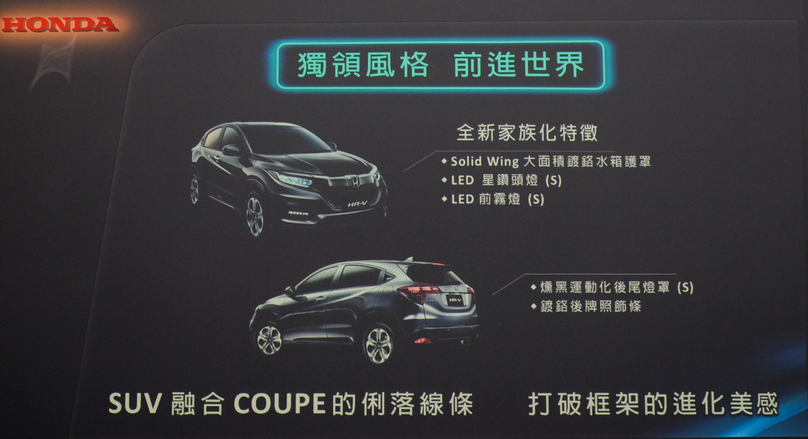 All NEW HR-V打造高質感且時尚的內、外觀設計,投注質感與精緻俐落的進化美感,散發令人無法忽視的個性風采;外觀部份,All NEW HR-V在厚實強勁的外型中,同時展現優雅、高品味的外觀風貌,搭配全新開發、具新式風格的前水箱護罩、前保桿,車燈部分1.8 VTi-S配有LED霧燈及飾條、投射式魚眼頭燈、高階的1.8 S則搭配LED星鑽頭燈、LED導光型尾燈,充分展現HR-V的品味時尚個性。