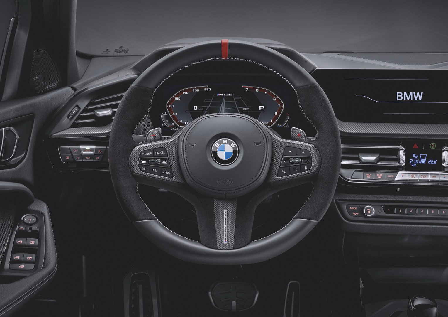 座艙內唯一升級就是M Performance方向盤,採用Alcantara材質於握把區域,手工縫製的紅色標示線在12點鐘方向,6點鐘方向則有專屬M Performance字樣,消費者可自行選擇碳纖維/ Alcantara或碳纖維/皮革兩種混搭來增強自己喜愛風格。方向盤後方配備運動型碳纖維材質換檔撥片,紅色的+與-號清楚知道操控方式,有畫龍點睛之效果。最後式一套天鵝絨並鏽有M Performance字樣地毯以及開門M Performance照地燈都是1系列專屬化套件。