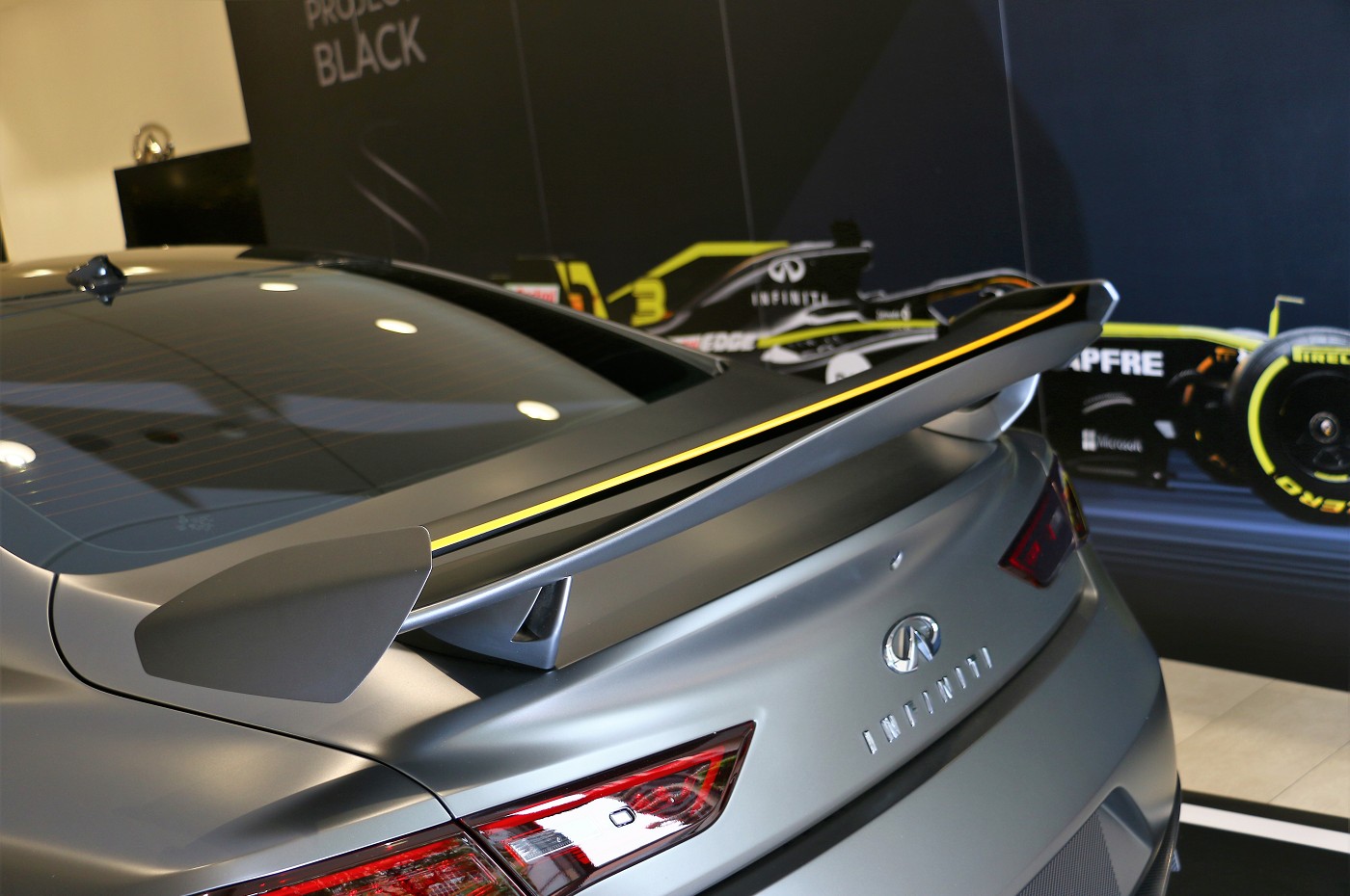 車身主要線條來自於Q60,PROJECT Black S保留原運動轎跑車的流線,要應付強悍的動力,設計師進行一系列的改變,創造出大膽的外型,其目的就是希望在高速時氣流能形成最大下壓力,車身的孔洞更能快速排出引擎熱能。在外型上採用碳纖維作為車身空力套件,它擁有非常高的強度與輕量化,並能提高空氣動力學的效率以及最佳高速下壓力,從Renault F1 Team合作的F1賽車上獲得靈感。