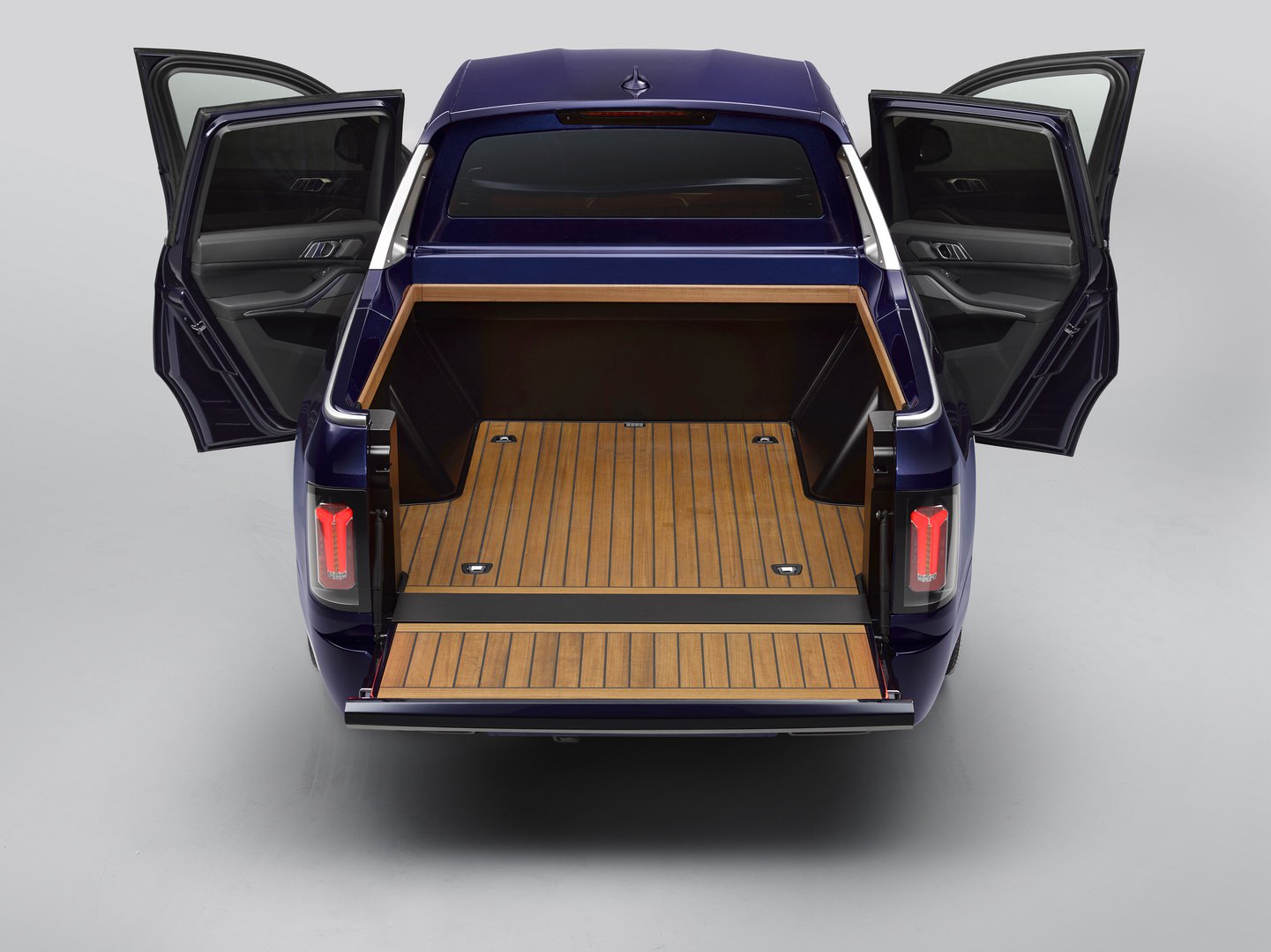即是X7的車身尺碼已經很大,但要打造一輛Pickup還是有些不夠,因此這輛車比一般的X7還要長了10mm,最後方第三排的兩人座直接廢除,也讓貨斗長度來到1.4公使,如果把尾門打開則可延長到2公尺的大小,足以運載一輛重機也不是問題,並且在車頂、後車門以及後尾箱門用上了CFRP才知,因此這輛車還比一般版本的X7還要輕上了200kg之多。車內則是五人做的基本設定,當然一切在X7身上擁有的豪華氛圍也保留下來。