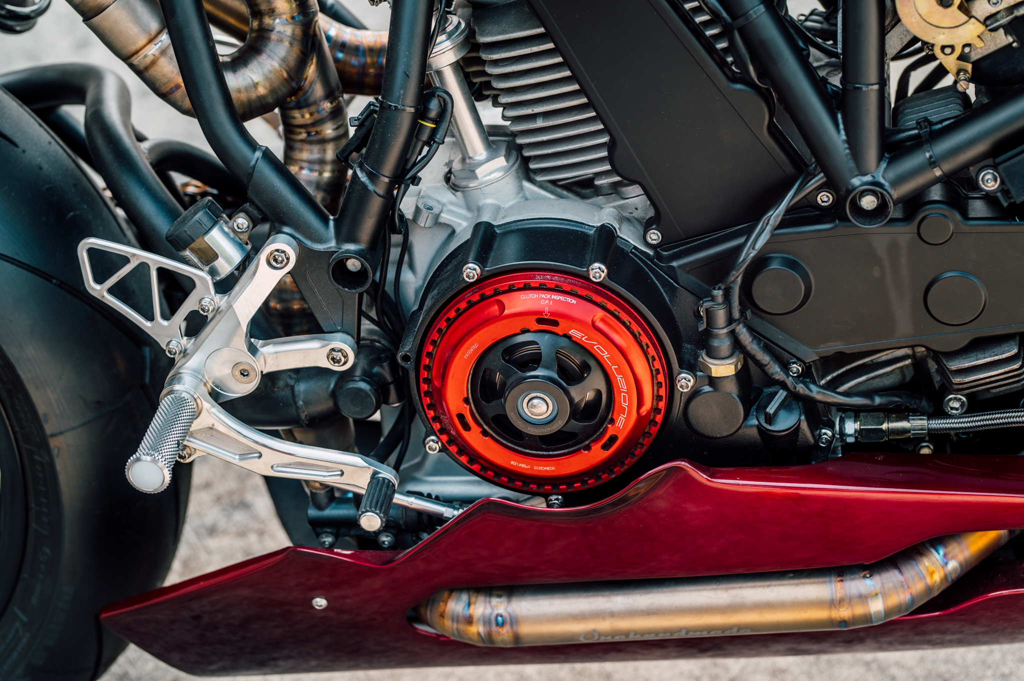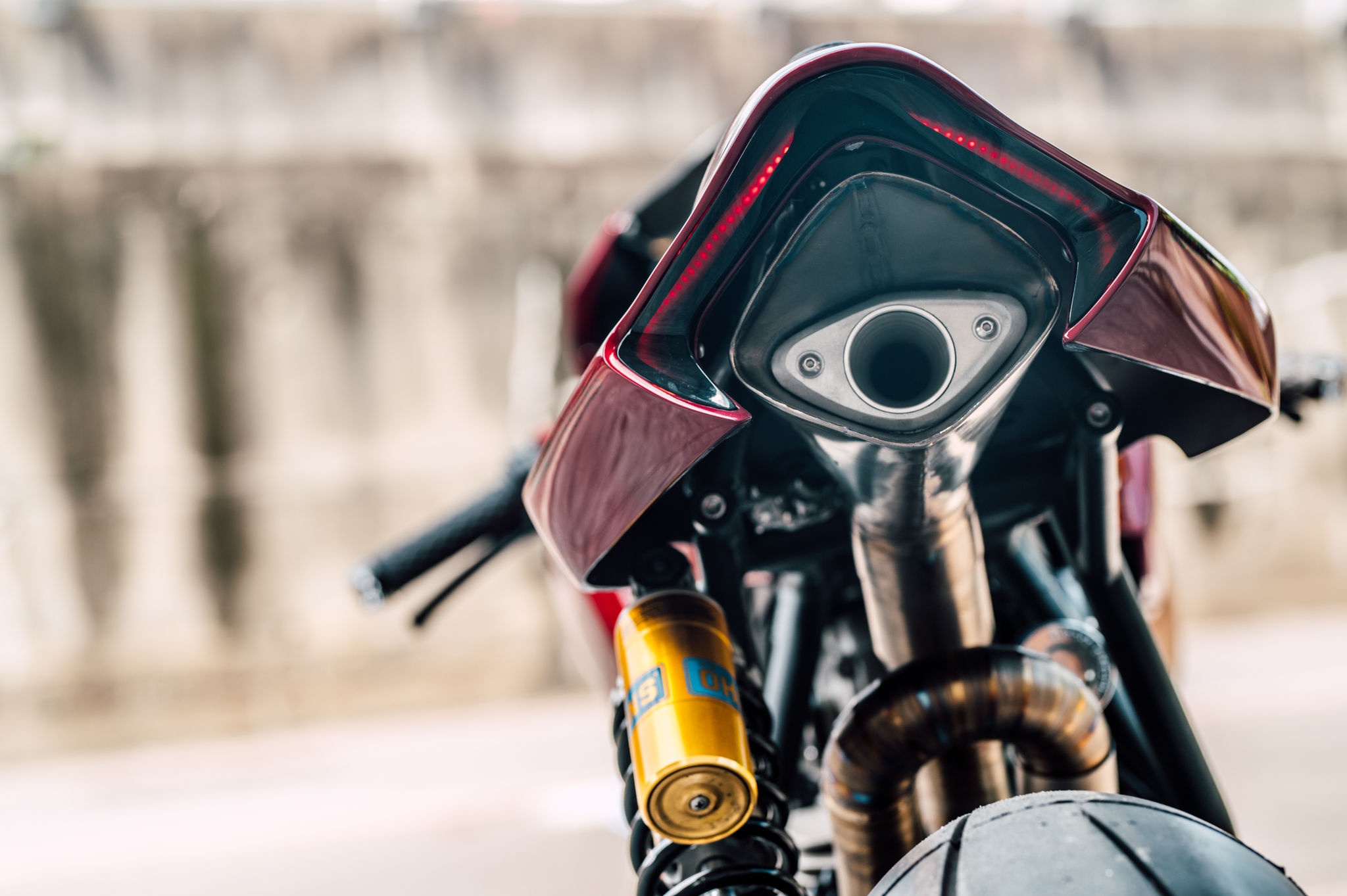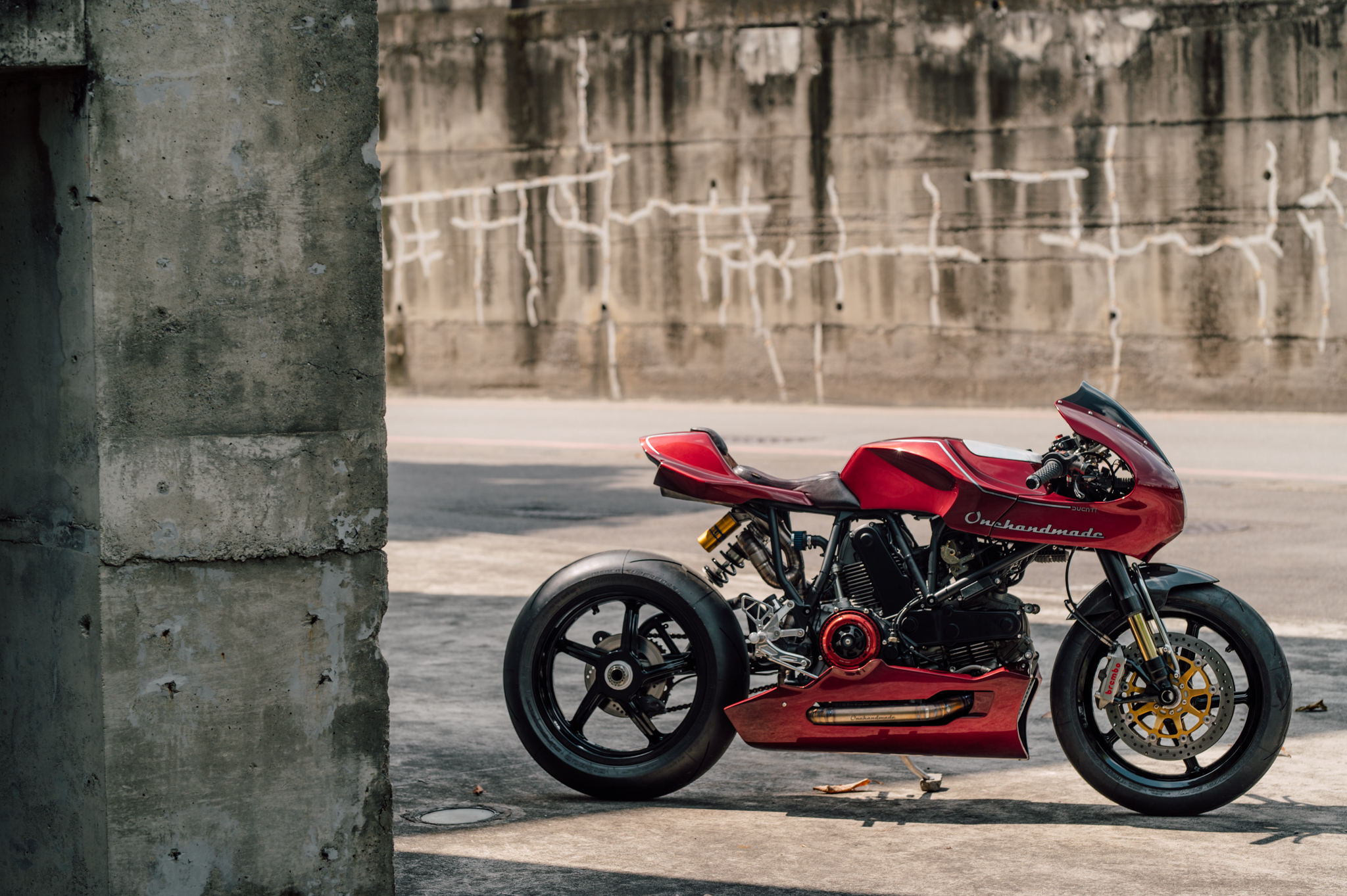 而ONEHANDMADE的工作不僅僅在於外觀整頓上,明顯的外觀升級方面:前方一對來自DUCATI monster 1100S的OHLINS前叉與後避震,Chun也安裝了一組防甩頭與來自1098的BREMBO制動系統,當然,腳上也配了頂級的PIRELLI Diablo Supercorsa。隱藏的升級包含了STM離合器、RCE新電池、訂製的三角台、Motogadget的儀表板。