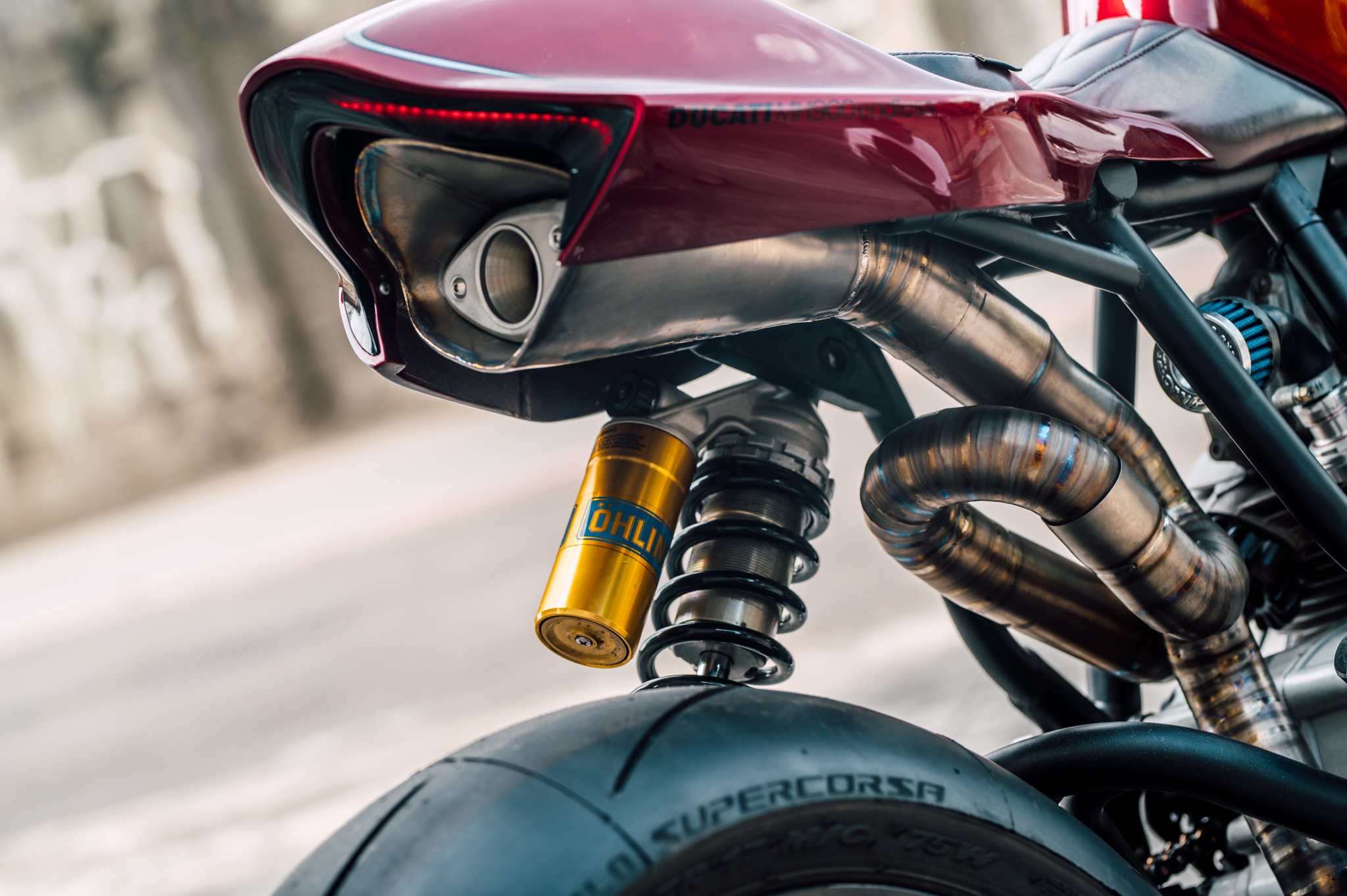 DUCATI現在擁有更銳利、更具侵略性的輪廓,但如果你仔細欣賞她的線條,你會發現在MH900e身上處處充滿著現代設計的工藝,卻又處處對比著經典的致敬。細節方面更是慢慢的愛情,前大燈用上了鋁合金材質的外殼包覆,尾燈則使用LED燈條作為主視覺,就像是鑲嵌在戒台上的鑽石一般,角度、線條與風格都精準到位。Chun同時也製造了一組全新鈦合金的排氣系統,穿過車架並一路延伸至後座蓋下方。