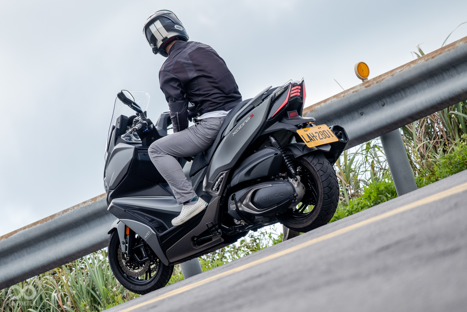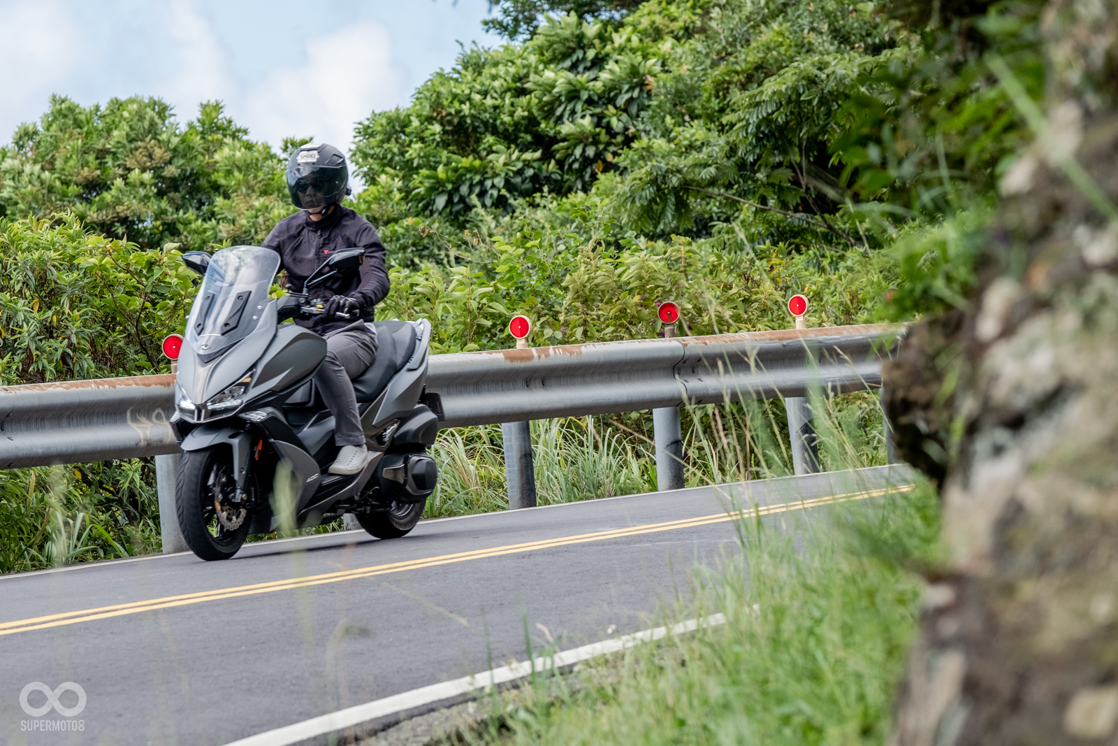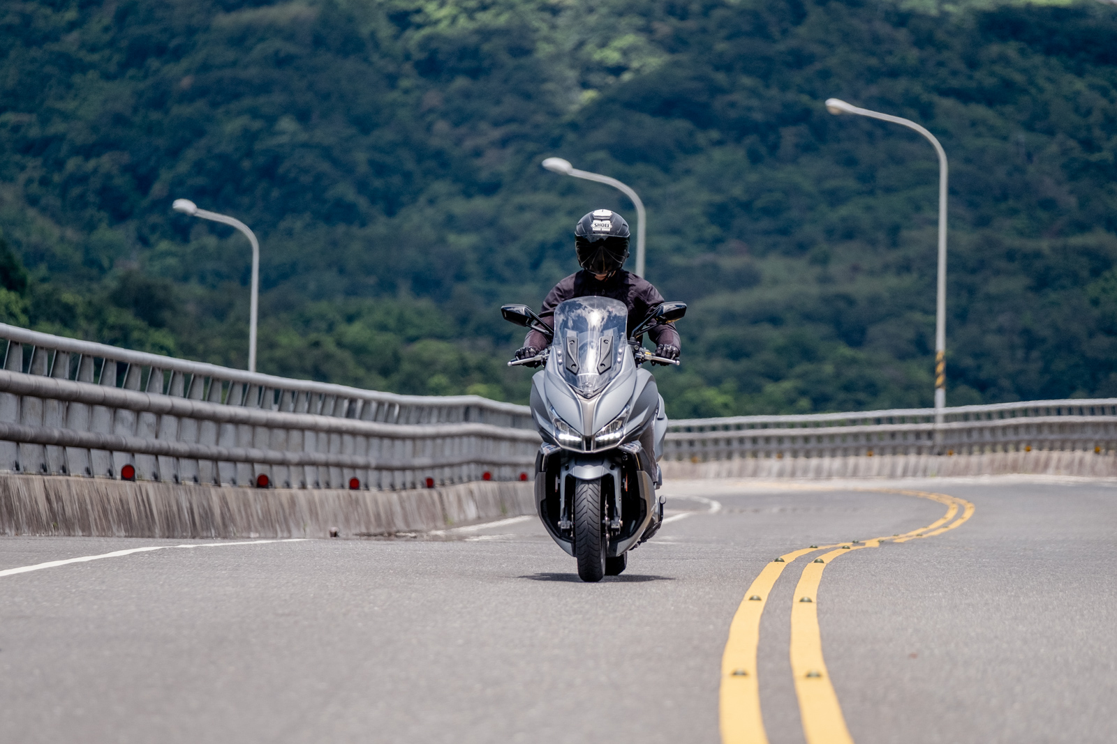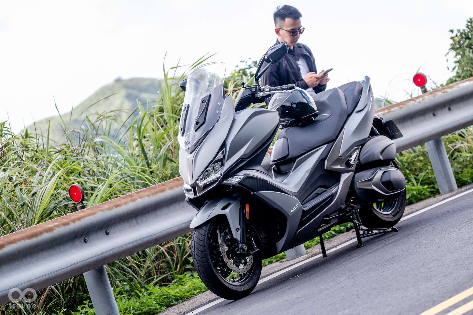 因為拍攝需求,我們也轉上前往九份的102縣道,這裡多的是緊湊的急彎以及不算寬的道路範圍,KYMCO XCITING S 400雖然無法與125級距速克達的靈活性相提並論,但當手指扣下煞車時,前雙輻射卡鉗發揮的制動力相當線性且足夠,較為運動的前後懸吊系統穩穩拖住車身,從煞車、傾倒、出彎,提供給騎士的樂趣可不僅是轉過一個彎角,而是會讓人不斷想持續探究車輛極限,並且享受沈浸在彎道中的穩定感。對比筆者一陣子前騎乘的HONDA NSS 300這輛較為通勤取向的車款,在懸吊的軟硬度以及彎中的回饋感,XCITING S 400顯得熱血不少。