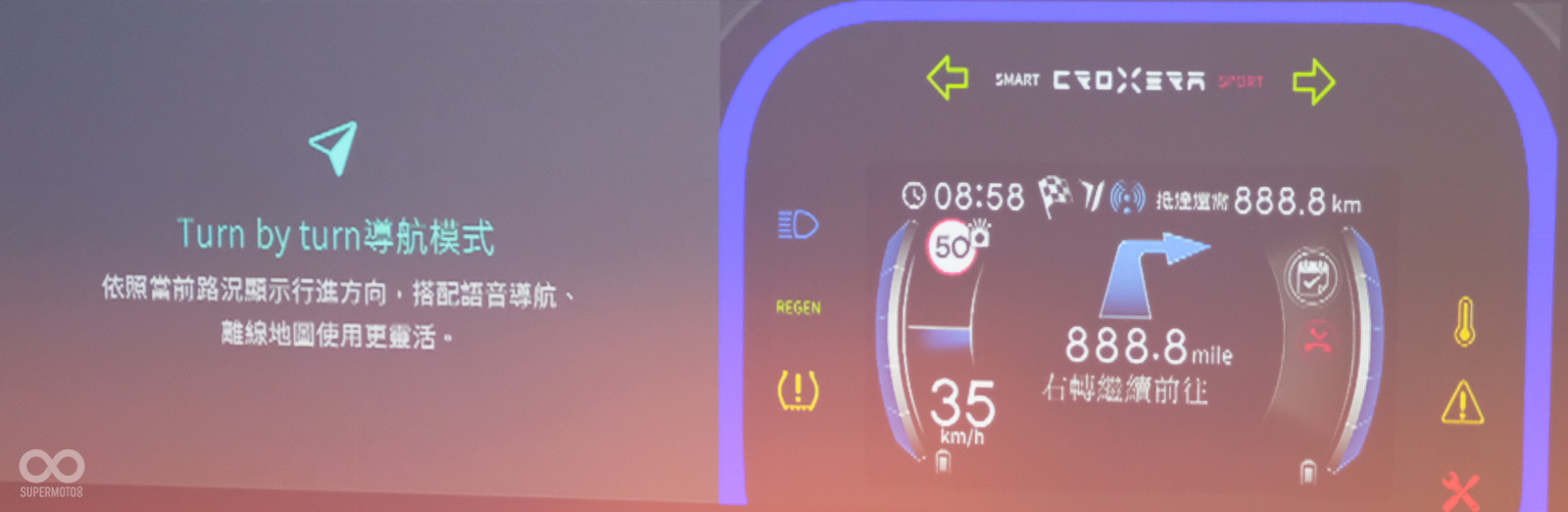 CROXERA智慧儀表在導航功能也針對電動車再次優化,只要在手機上設定好目的地並開啟導航功能後,導航軟體還會一並加入建議換電站功能,讓騎士在長途使用時可以降低找尋換電站的時間。