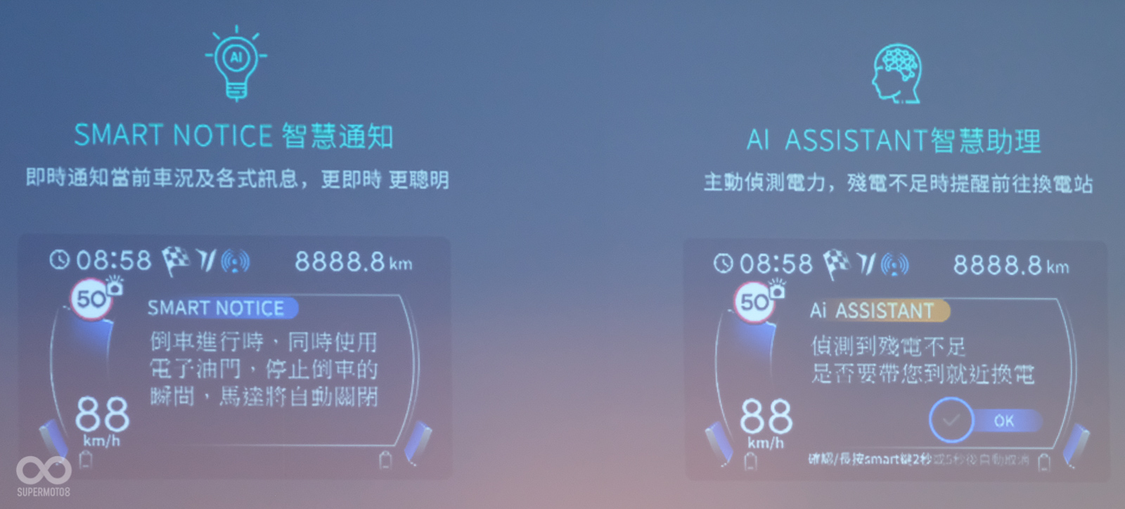 另外也導入SMART NOTICE智慧通知功能,即時通知當前車況及各式訊息,更聰明更即時可提供騎士第一手消息,以免造成危險且能夠及時提醒騎士。