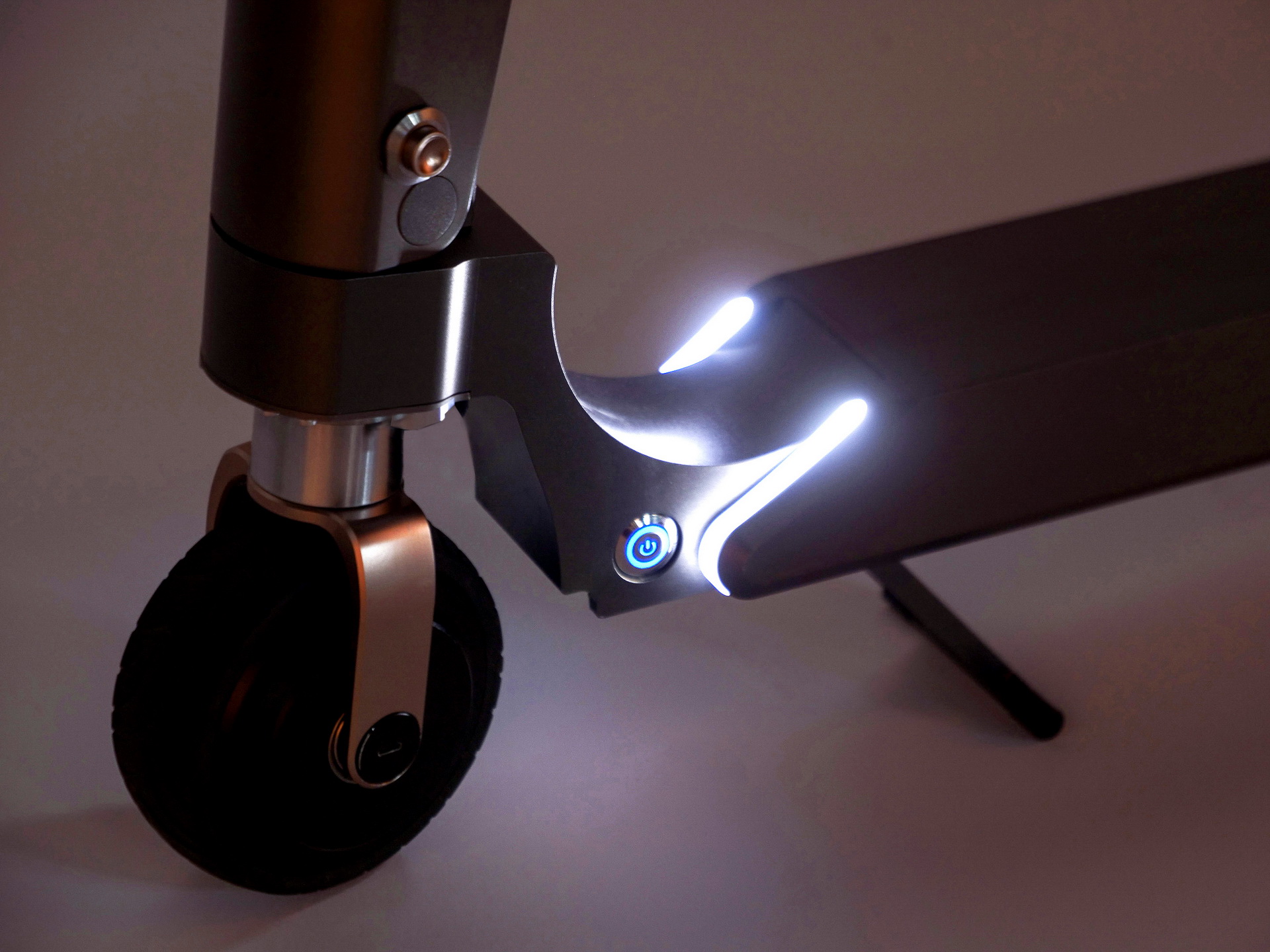 因為採用了後輪驅動系統,前輪的負載較輕更容易操控,同時也可以增強安全項及穩定性,在前輪還有懸吊系統的設計,提供顧客平穩的騎乘感受,上頭可以連結手機組成螢幕,顯示電池的電量狀態、速度以及導航模式,全車僅重7.7kg,且可以用單手收納,未來在這輛車上還會安裝上動能回收系統,預計可以提昇7%的續航里程。