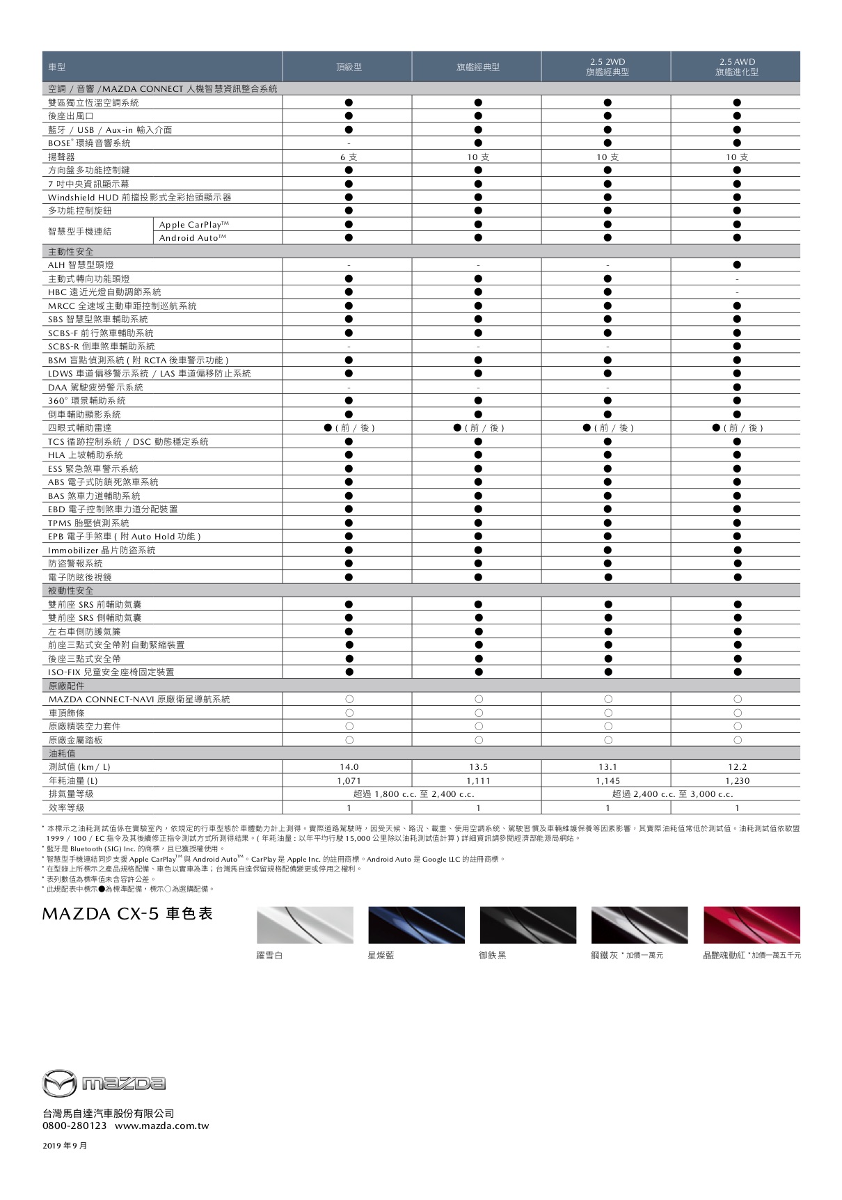 為持續優化MAZDA CX-5的車系陣容並滿足消費者的期待,台灣馬自達針對2020年式MAZDA CX-5進行編成調整並升級配備,共推出頂級型、旗艦經典型、2.5 2WD旗艦經典型與2.5 AWD旗艦進化型四款等級。在維持相同售價之下,全車系標配MRCC全速域主動車距控制巡航系統、360°環景輔助系統以及Windshield HUD 前擋投影式全彩抬頭顯示器,而旗艦經典型更配有駕駛座八向電動調整附記憶功能、副駕駛座六向電動調整座椅與彰顯豪華質感的雙前座導流式通風座椅。2020年式MAZDA CX-5正式售價自111.9萬元起,於今日正式展開接單。