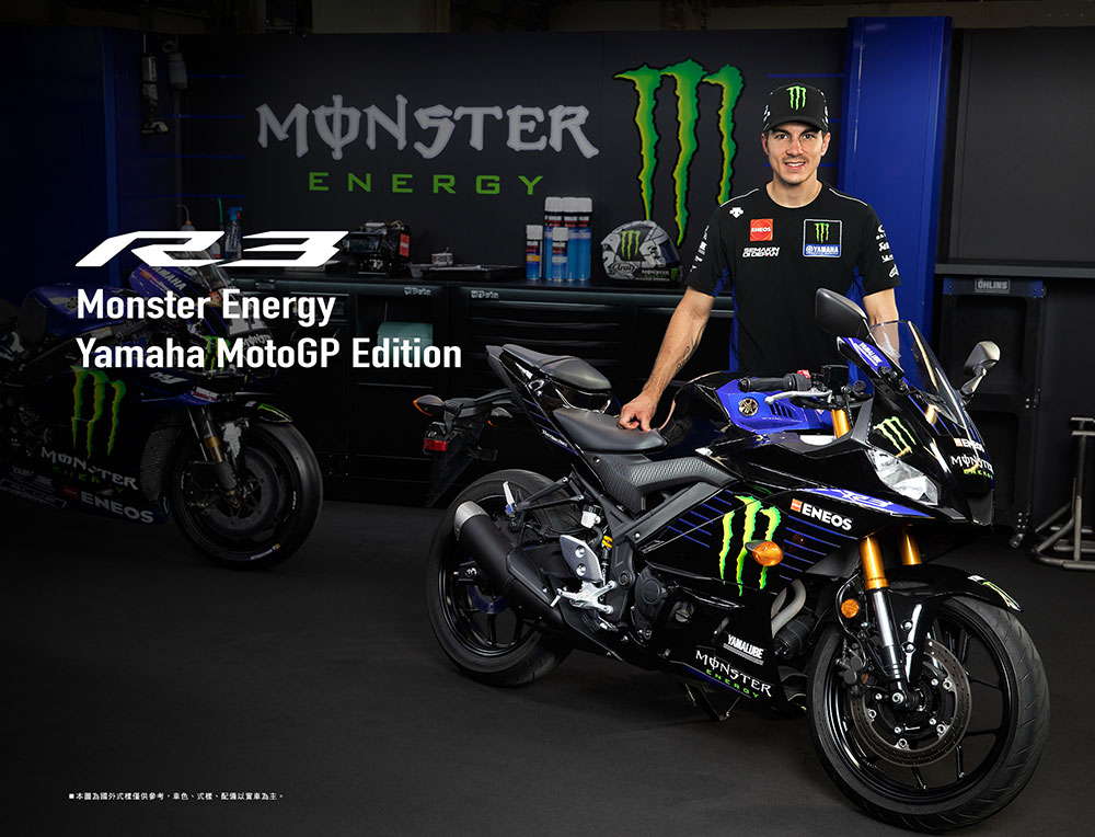 Yamaha將為「YZF-R3」帶來Yamaha MotoGP工廠賽車—「YZR-M1」的塗裝、在台限量發 售「YZF-R3 Monster Energy Yamaha MotoGP Edition」。