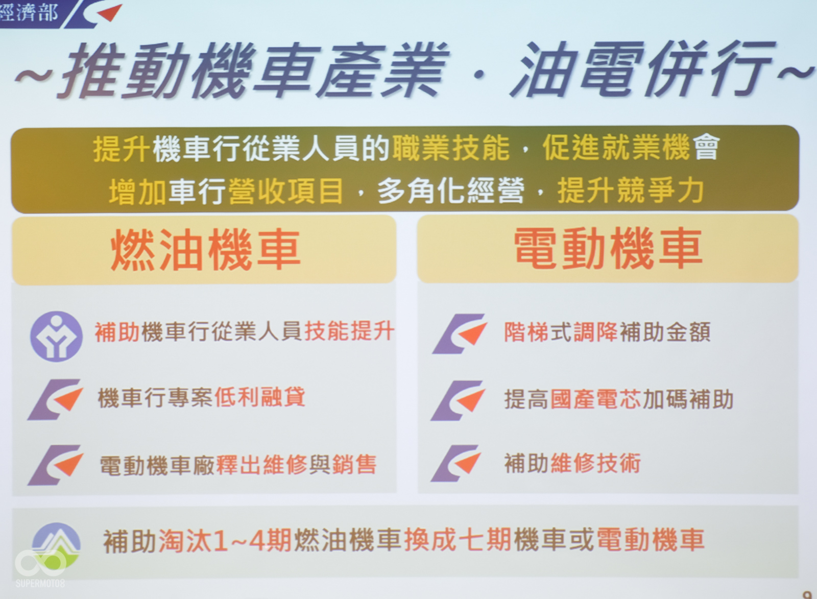 行政院8月8號拍板機車行轉型府政策後,未來四年將投入4.5億元,輔導1萬家機車行轉型升級。透過全台18場的說明會宣導政策規劃,並與國內車廠以及公會合作,開設機車維修技術課程(含油電),提升現有車行的技術能力,甚至還提供專案低率貸款,讓傳統車行有足夠資金進行店面升級、技術升級等需求,達到油電並行發展的政策目標。