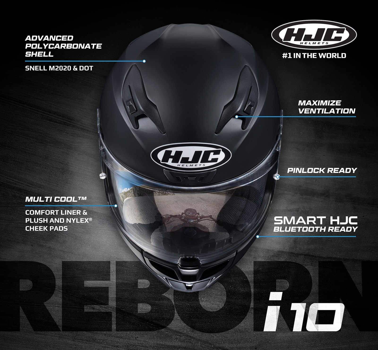 HJC i10由該品牌旗下的CL-17改善而來,可視為這個品牌旗下最暢銷產品的大改款帽型,它採用了聚碳酸酯外殼打造而成,但是官方並未在新聞稿中公布重量數據,原廠也強調這款帽子甚至可以將騎士的騎乘體驗從原本的單調改為有趣的冒險!而一大亮點莫過於HJC i10內建藍牙耳機、主機的預留孔位,可搭配自家的SMART HJC套件使用,提升不少安全帽的實用性。