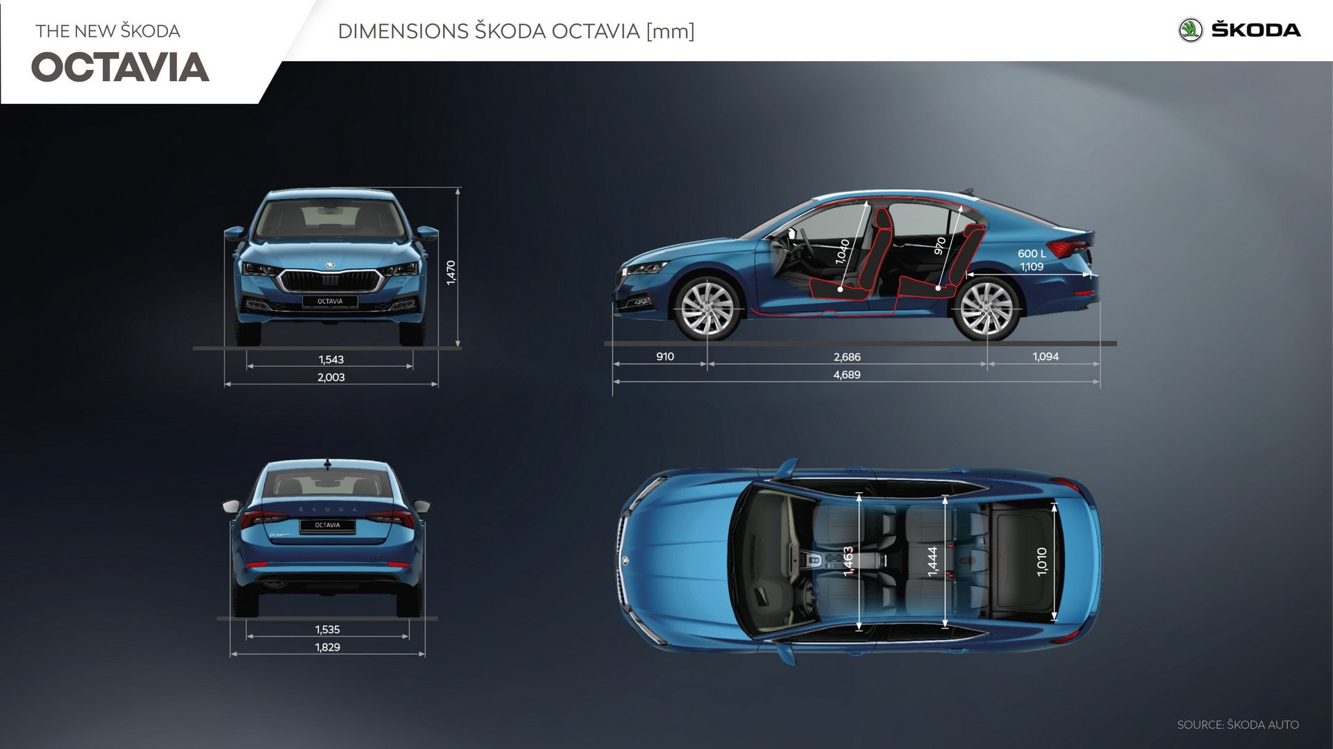 Skoda Octavia進入了第四代車型,同樣擁有了Sedan房車以及Combi旅行車兩種車款,改款後整體的車格又更大了一些,比過去長了19mm來到4689mm,也寬了15mm來到1829mm,在Combi車型上則是長了22mm寬了15mm,兩者皆有2686mm的軸距,這點則是與上一代的車型相同。行李箱容積Sedan為600L,Combi為640L,分別增加了10L以及30L。