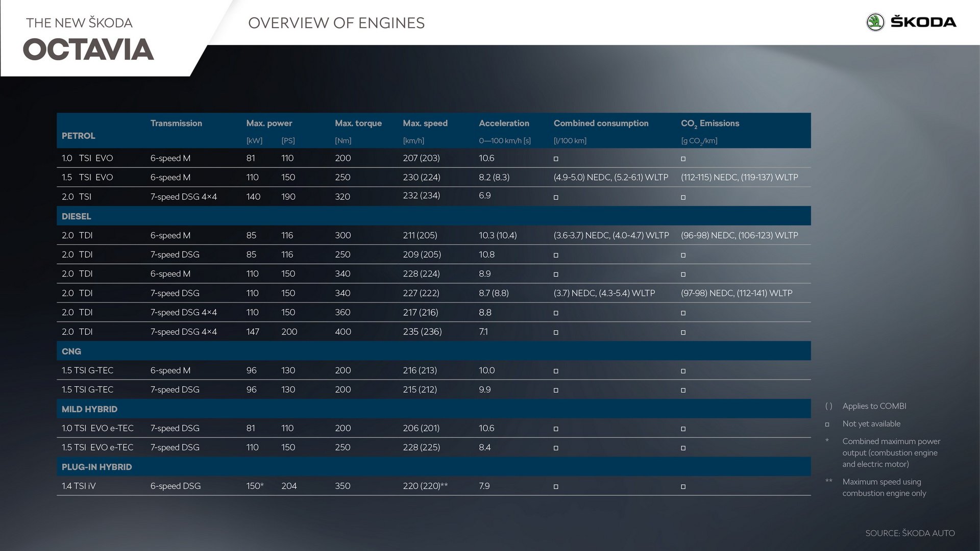 動力選擇上贏來的有史以來第一次的PHEV插電式油電複合動力車型,該車型命名為Octavia iV,動力單元包含了一具1.4L的汽油引擎以及一個電動馬達,整體的粽效輸出來到了204hp/35.7kgm的表現,搭配上六速的DSG變速箱,百公里加速需耗費7.9秒完成,內含的13kWh鋰電池在WLTP的測試當中擁有55km的續航里程表現。