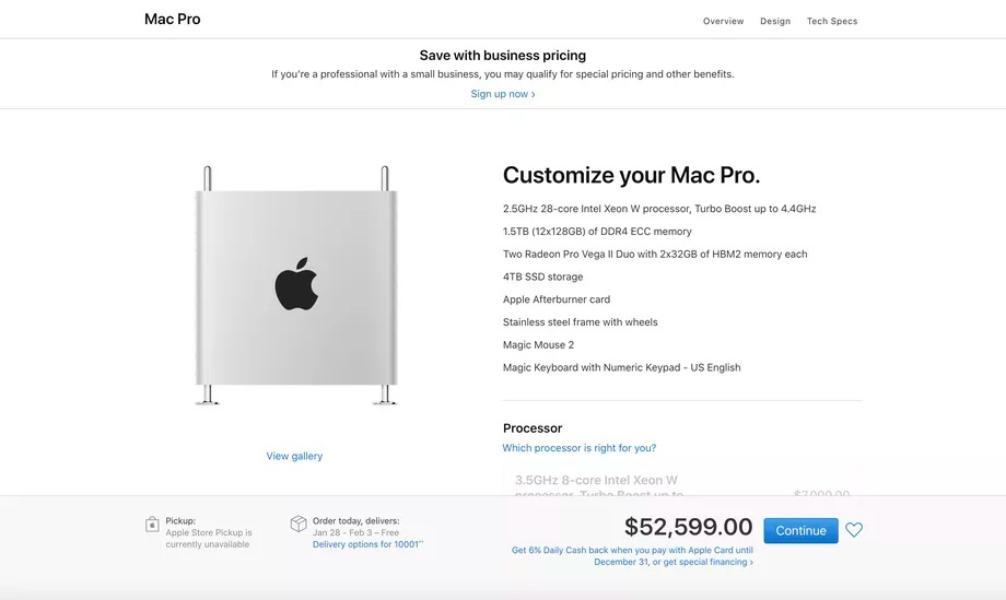 基本售價:5999美金(約18.2萬台幣),此為最入門的Mac Pro,配有3.5GHz八核心Intel Xeon的CPU、32GB RAM、Radeon Pro 580X顯卡和256GB SSD硬碟。