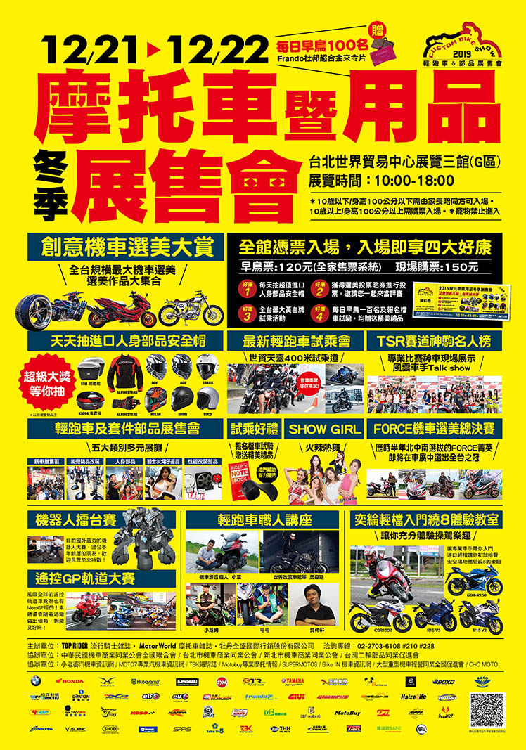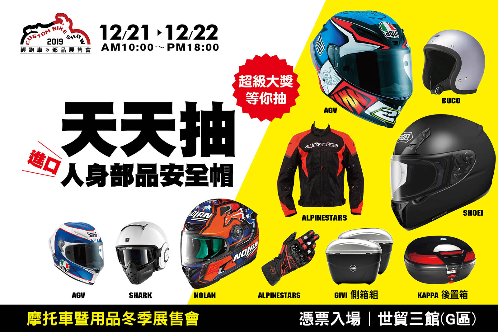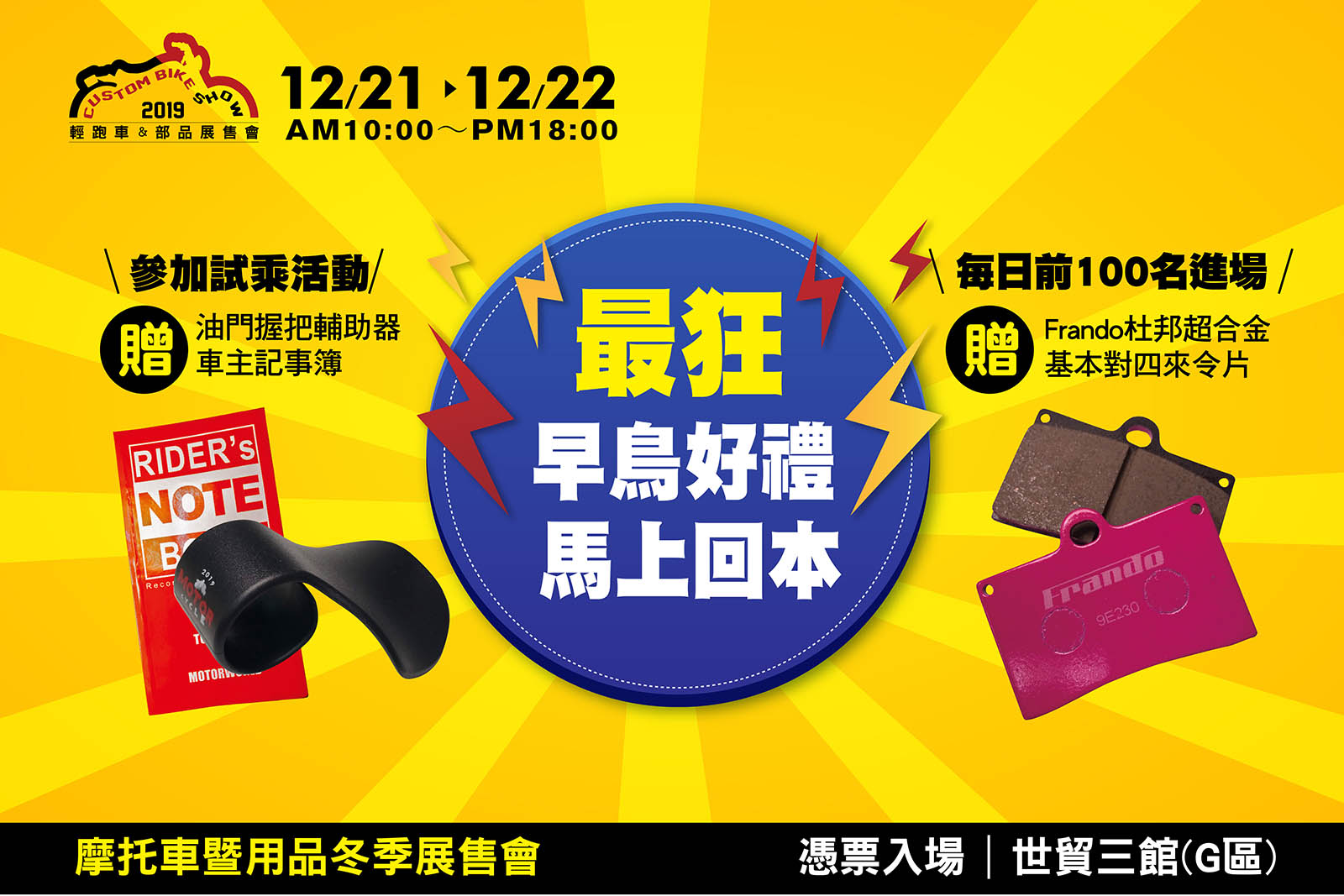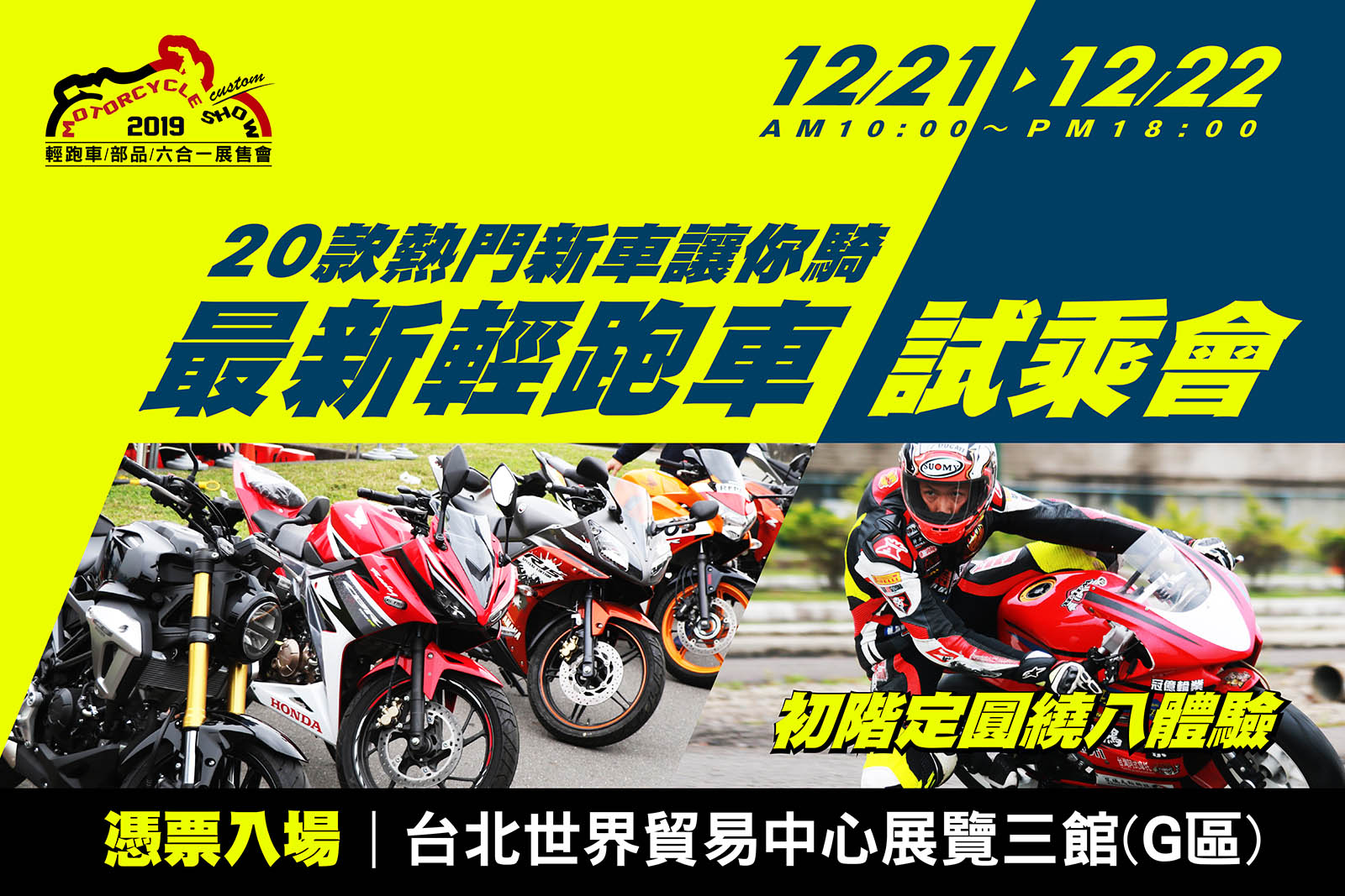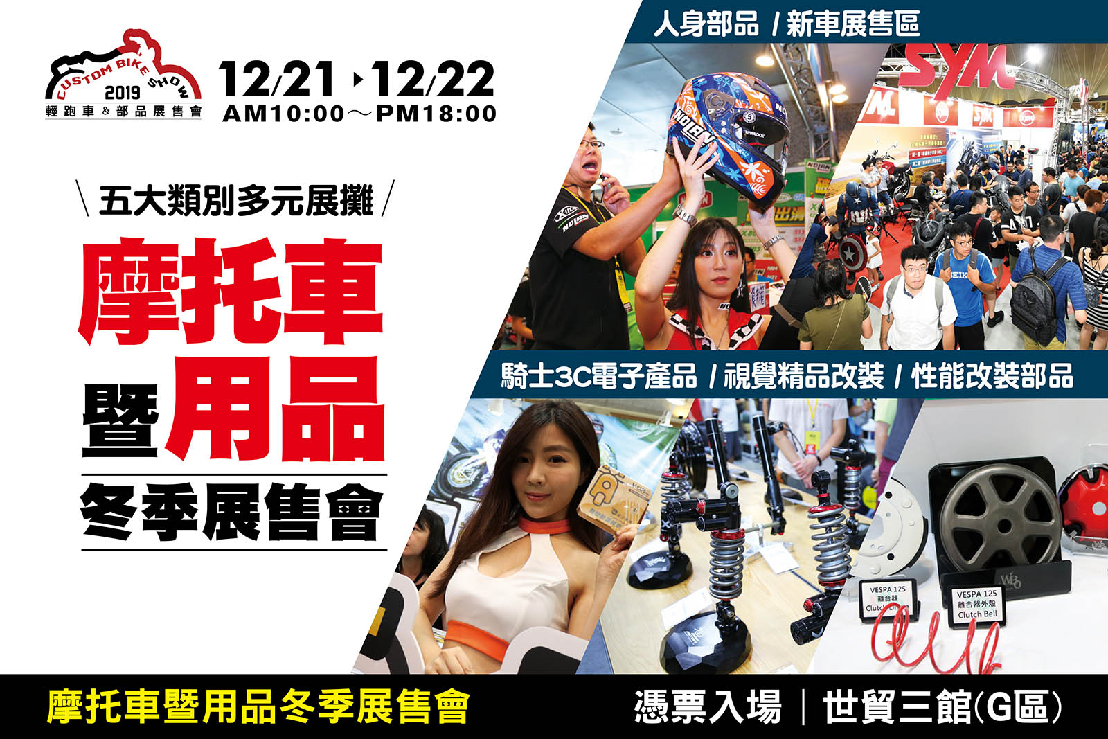 相信各位讀者都是喜歡機車的熱血騎士,那你千萬要注意到即將在本週末(12/21-22)舉行於台北市世貿三館的「2019摩托車暨用品冬季展售會」,這場活動主打新車展示以及部品販售,過往受到歡迎的新車試乘區也移師到世貿三款停車場頂樓舉行,讓騎士可以體驗到話題新車以外,也可以為自己添購改裝部品、人身裝備使用。