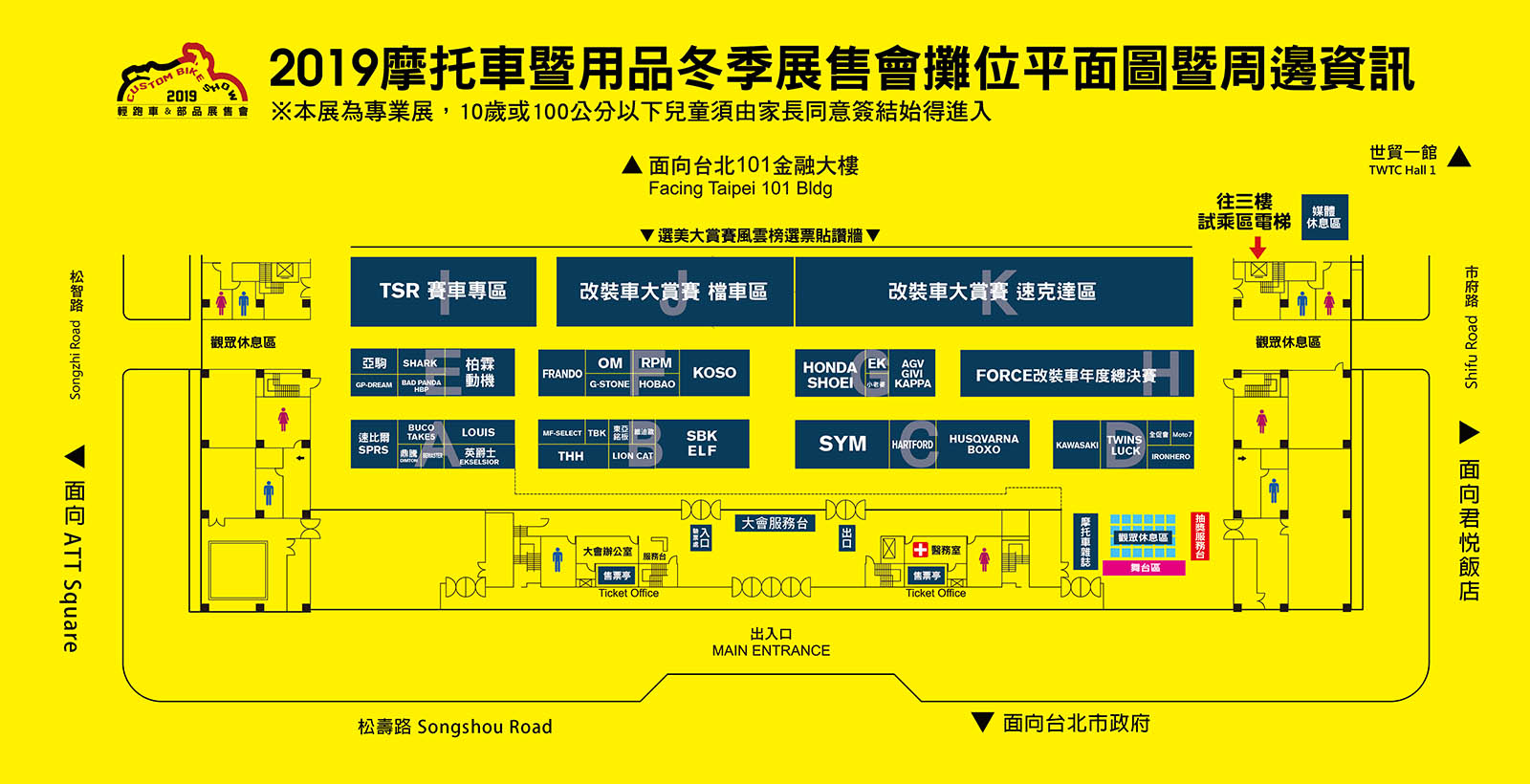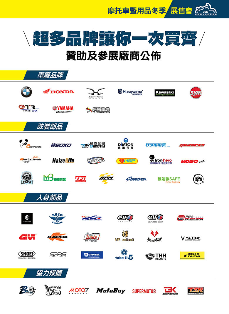 2019摩托車暨用品冬季展售會簡單分為三大部分,新車展示、改裝車選美、人身/改裝部品展售、新車試乘體驗。
