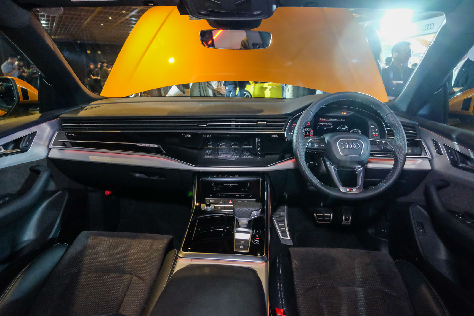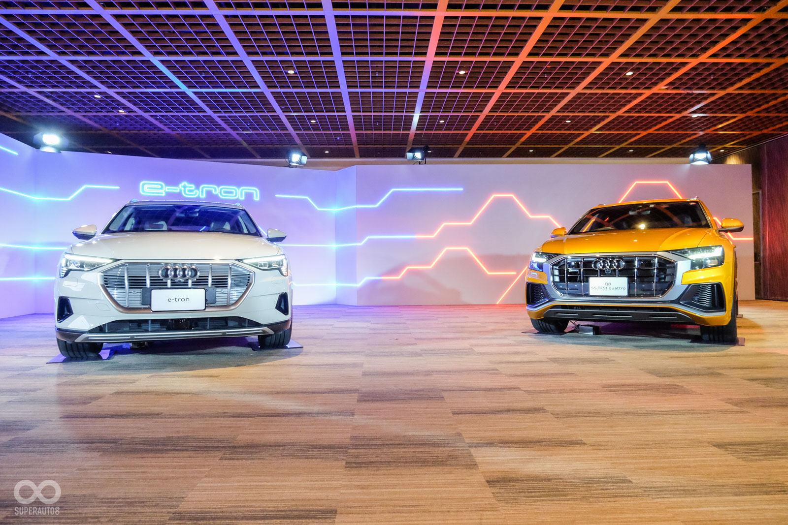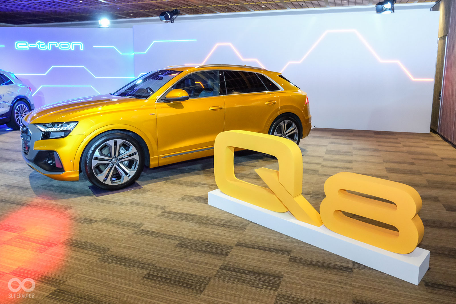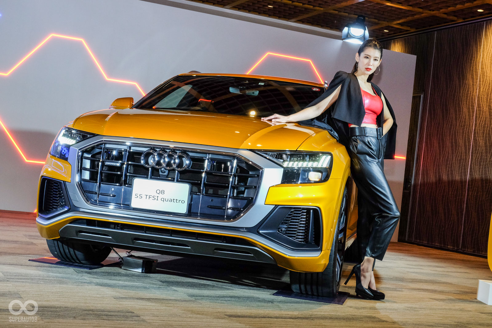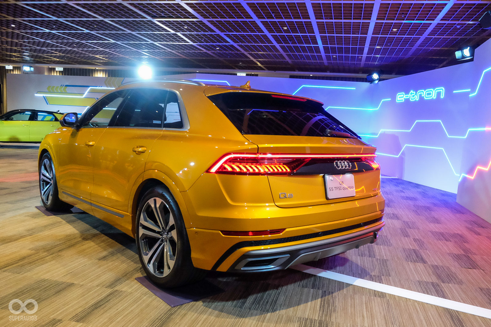 Audi Q8為該品牌最新的旗艦運動休旅車,從車頭看去視覺效果相當大氣,車尾與Q7截然不同,採用極為流線、下斜的運動化設計,展現出年輕動感的車輛格局,今天展示的車輛為55 quattro S line版本,動力系統搭載V6渦輪汽油引擎+48V輕油電系統,可產生340hp以及250Nm的馬力與扭力,搭配tiptroinc八速自手排變速箱,可達成0-100km/h加速5.9秒的成績。原廠預計2020年導入台灣,詳細時間與規配仍在研議中。