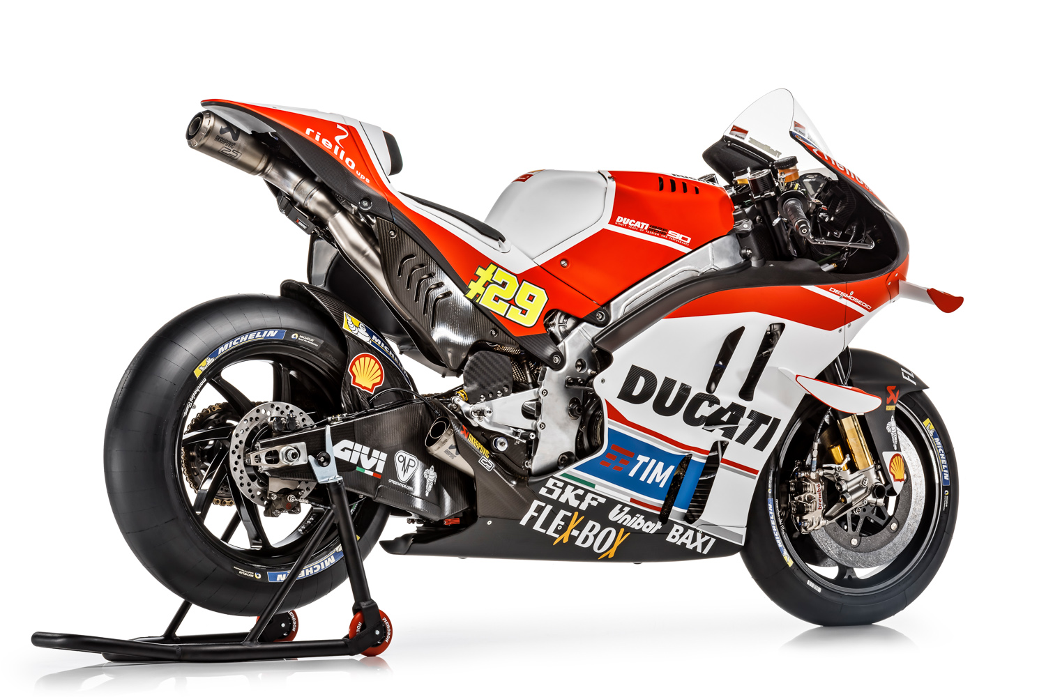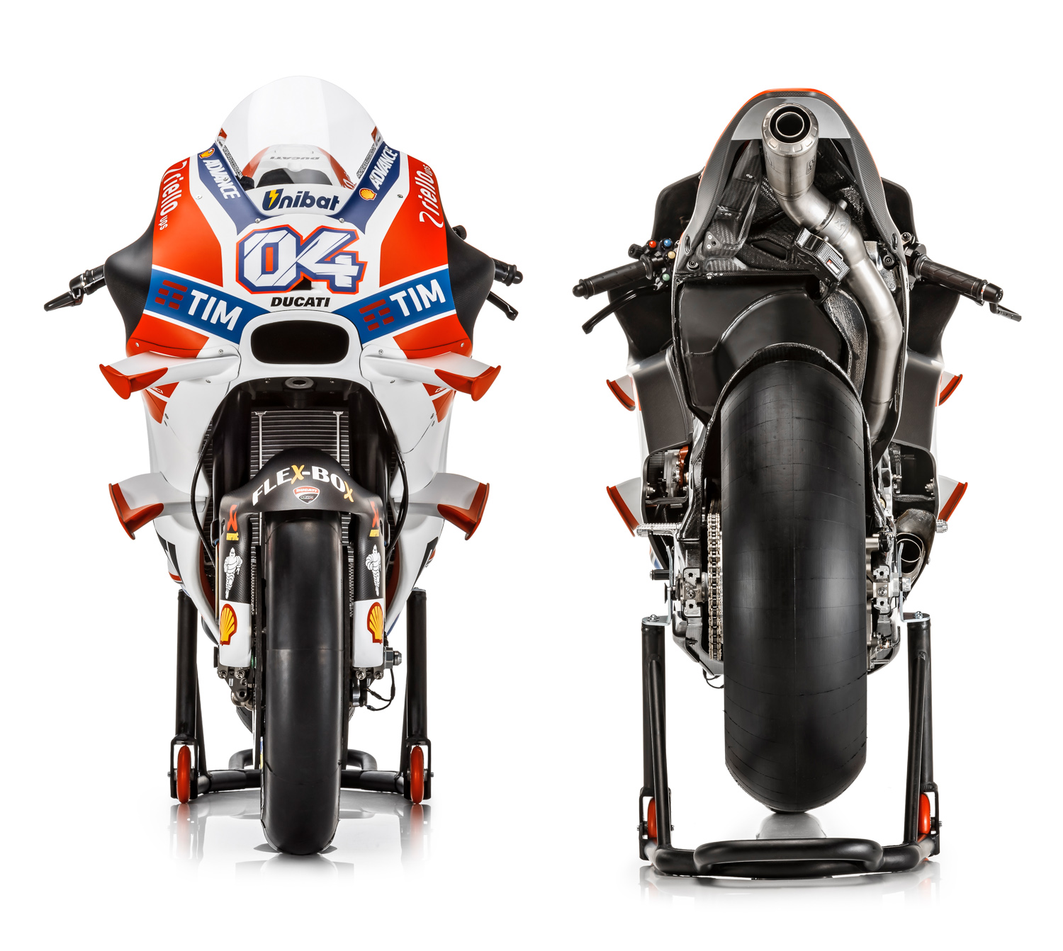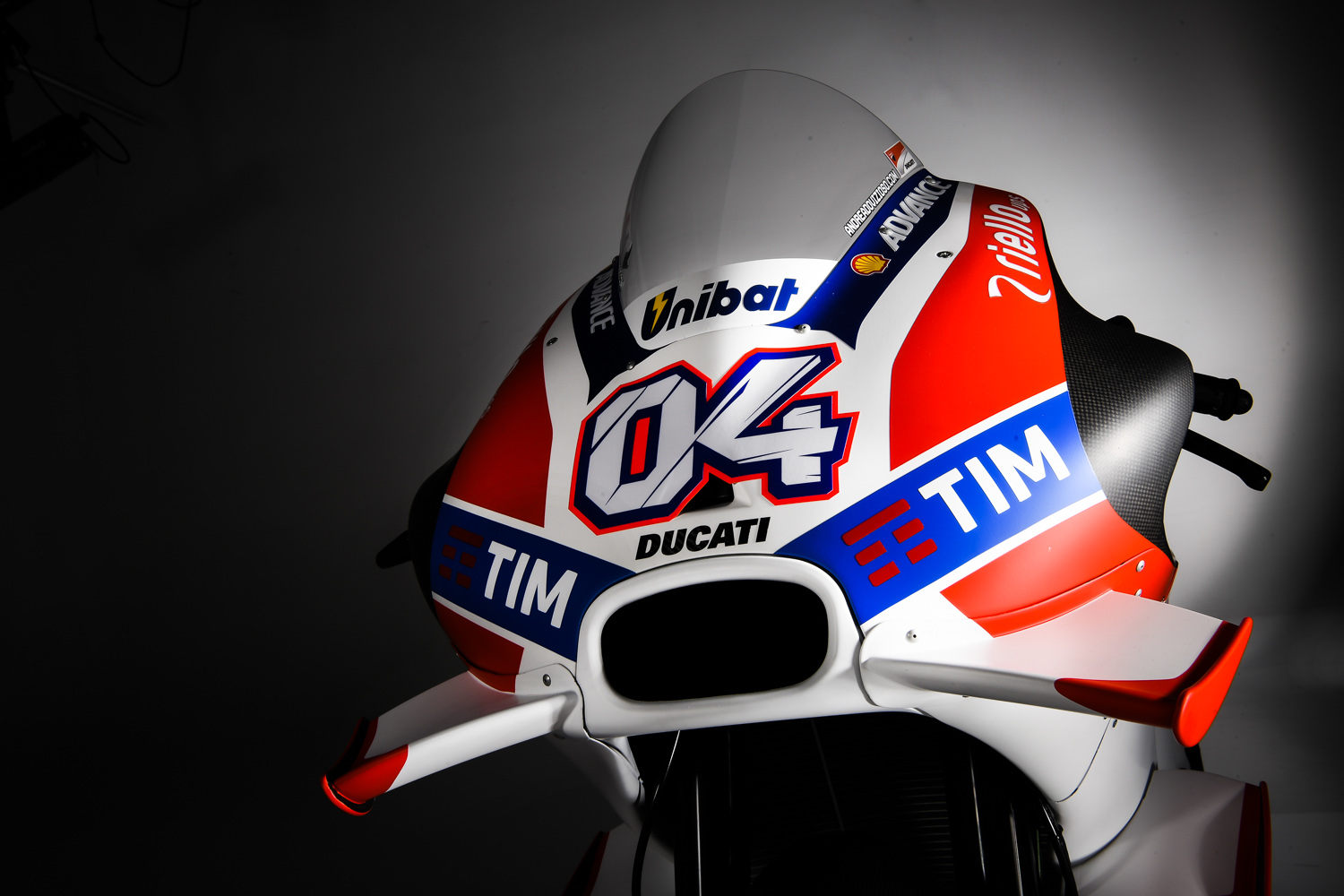 戰駒Desmosedici GP 16彩繪與過往雷同,主要贊助廠商並沒有改變,但在車身比例上我們發現GP16比起去年的GP15車身更修長比例更優雅,和過去扁頭的設計相比有回歸正常的感覺!當然最讓人矚目的還是那四片醒目的導流翼片,過去一直以碳纖維原色出現,GP16上的翼片首次染上了車身塗裝,整體來看DUCATI全新的戰車比過去漂亮許多,也期望新賽季能為他們帶來好的成績。