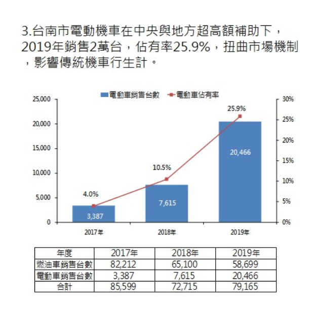 以台南市為例,在中央、地方的高額電動車補助下,2019年台南的電動機車銷量突破20,000台,佔台南新車銷量25.9%,相比2017年成長六倍之譜,而燃油車2017年與2019年相比則下跌23,000多輛,對於當地機車業者來說影響相當大。
