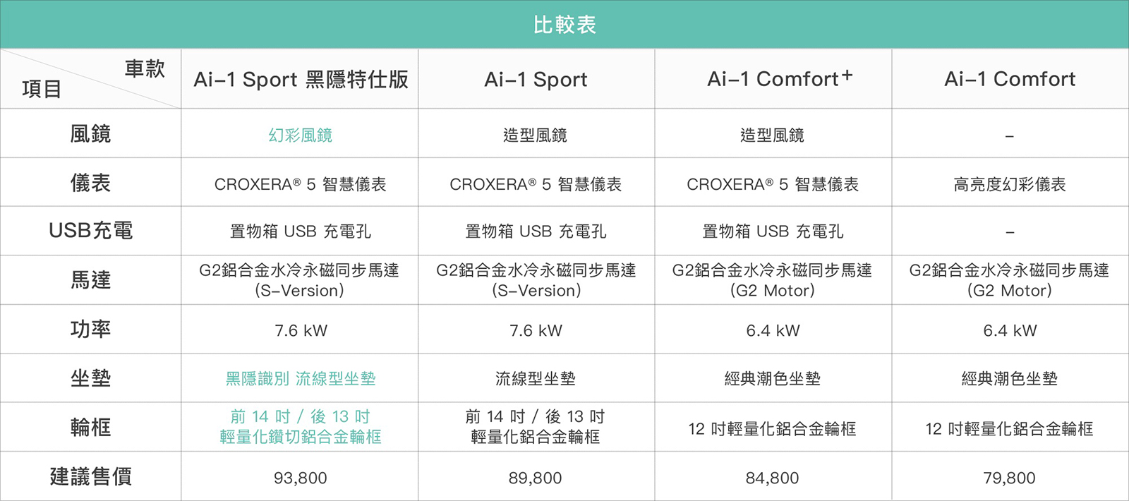 宏佳騰這次推出的國民電動車「AI-1 Comfort」同樣採用Power By Gogoro Network架構,動力部分採用G2水冷鋁合金永磁馬達,擁有6.4kW@3,000rpm的最大功率,搭載12吋輕量化輪圈;另外這次Ai-1 Comfort也特別搭載全新的儀表設計,同時還推出搭載大獲好評的CROXERA智慧儀表的「Ai-1 Comfort+」版本。