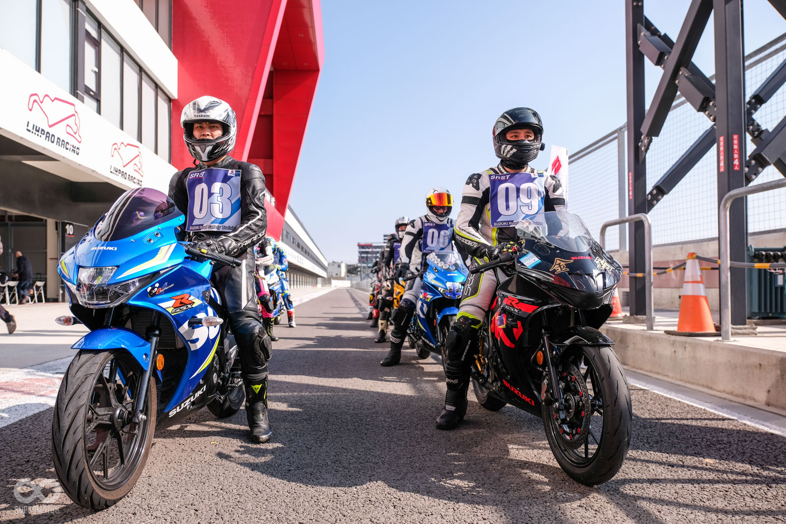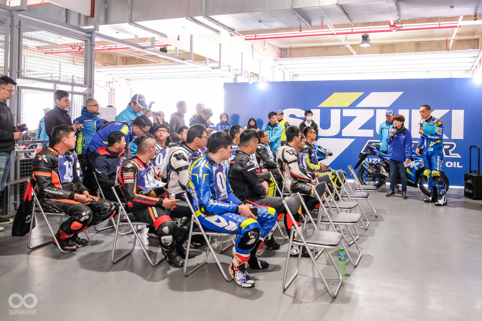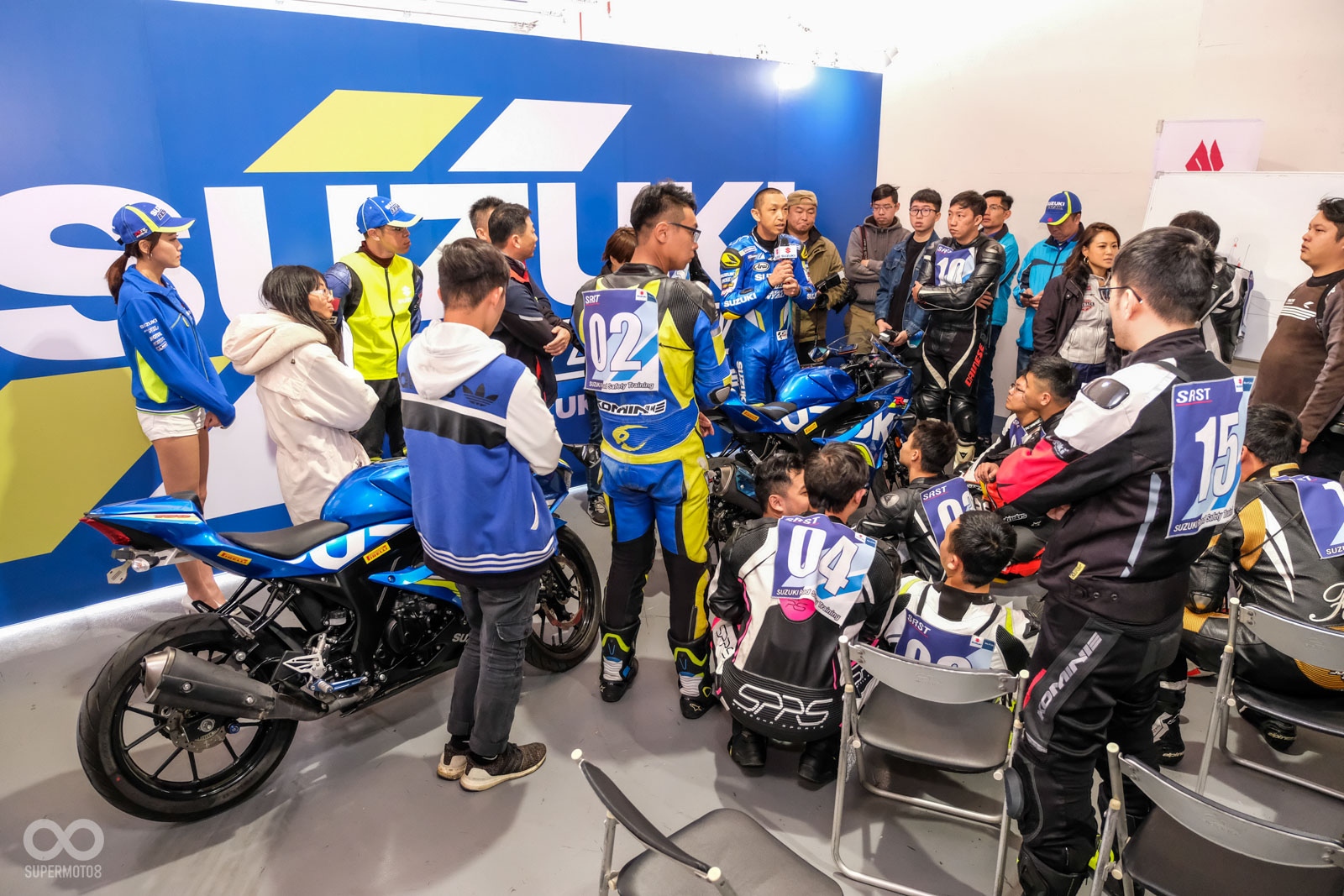 筆者要特別描述一下這個環節,青木宣篤選手不只在賽道上不斷觀察大家的騎乘動作、煞車點以外,有時也會停在賽道緩衝足夠的空曠處檢視每位學員的過彎姿勢,另外在講解區也放置一輛GSX-R 150讓青木宣篤選手可以隨時示範需要改進的重點。並透過三次的騎乘、改進機會給予車友回饋,確保學員可以穩定進步並且找出自己的問題點。