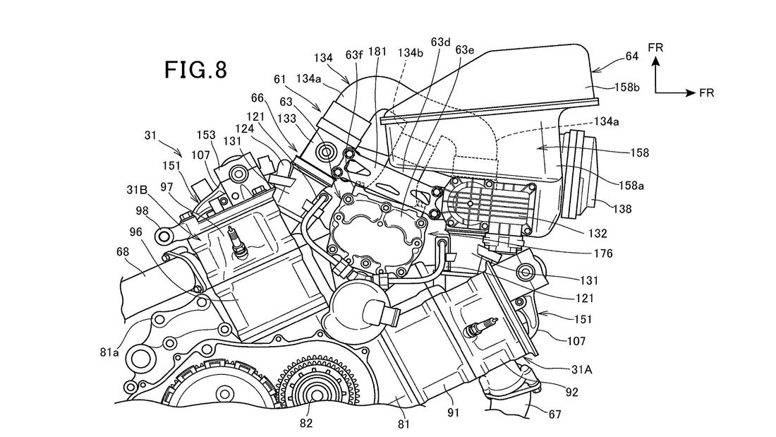 從新的專利圖上可以看到不少細節的更新,像是汽缸蓋上各有一個鏈傳動的凸輪軸,而增壓壓縮機本體,則是透過前汽缸左側延伸至曲軸的傳動裝置所驅動,另外HONDA替每個汽缸都配備兩組直噴噴油嘴,一組向燃燒室噴油,另一組則向進氣岐管噴油。