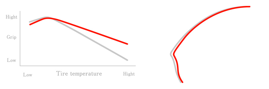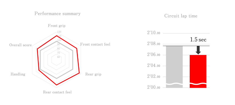 過去BT-003在膠料設計上偏軟質,熱胎快但高溫抓地力下降的快,這次Bridgestone針對過往的問題修正,RS10的膠料在犧牲些微冷胎抓地力下大幅提昇了高溫抓地表現,輪胎形狀同步進化使胎肩角度更大,在過彎穩定性與車輛靈活度都獲得明顯的提昇。