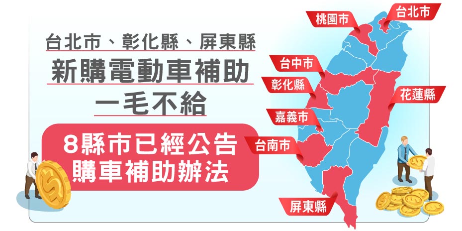 根據最新資料顯示,目前共計八個縣市已經公告,不再補助購買電動車(新購條件)共計三個縣市「台北市、彰化、屏東」;而補助調降最多者為花蓮高達(-50%),其次桃園(-40%)、台南(-20%)。