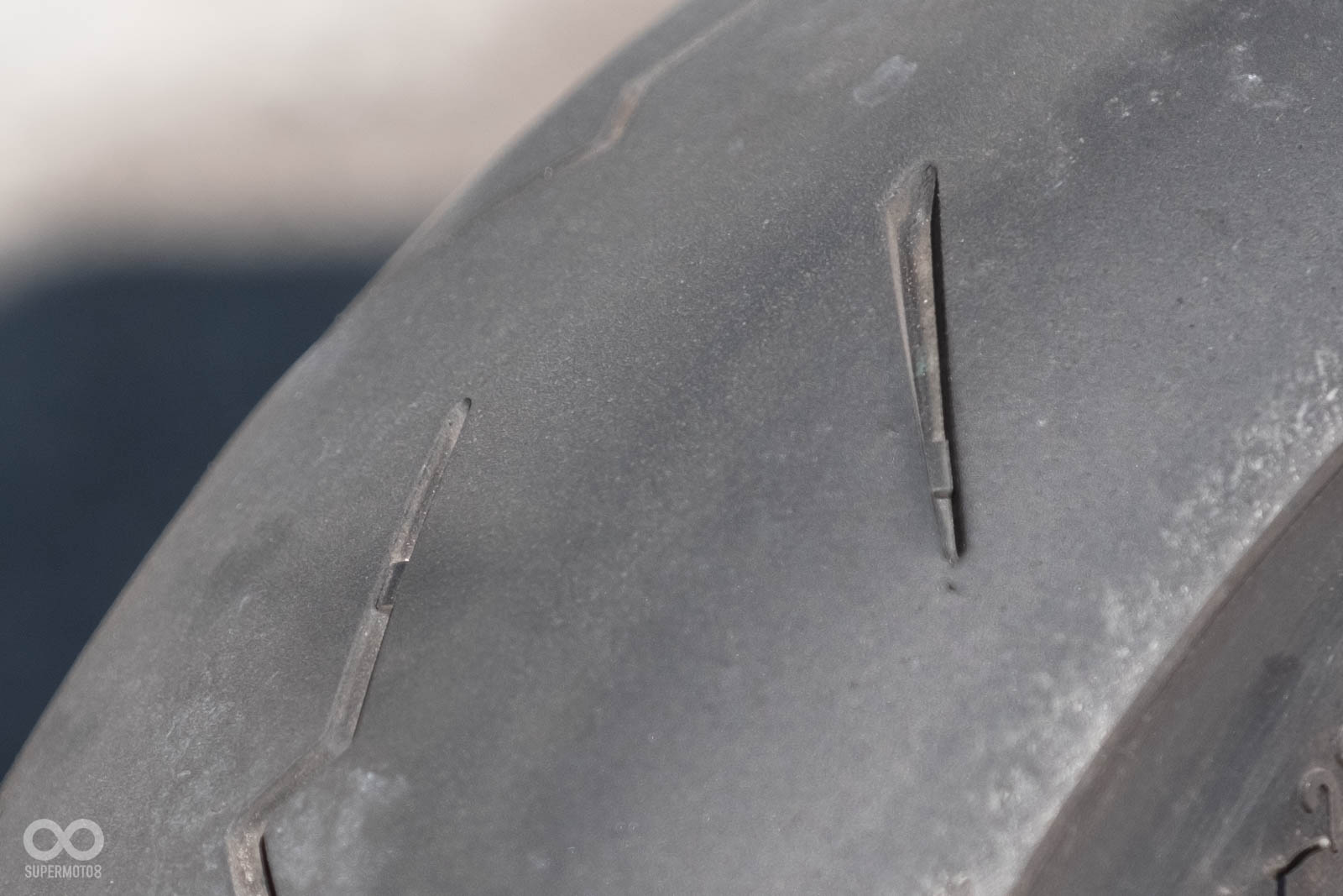 從外觀來看,整體胎型在經過1300多公里之後,胎型並沒有明顯的磨耗變形,中央胎面看起來依舊相當尖,由於幾乎都是跑長途直線的關係,輪胎左右兩側甚至都還能看到胎毛的存在。