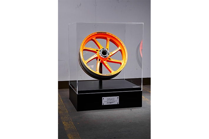 除此之外HONDA還貼心附上了展示架,並在新聞中提到展示架升級,對比舊版本僅有簡單的固定座,2020年販售的輪框擁有外頭的透明保護殼,輪框也被用特別的角度豎立於中央,原廠特別強調這個角度讓輪框看起來價值更高,更美!