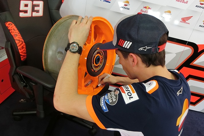 本次公開販售的零件是2018年HONDA MotoGP廠車RC-213V的前後輪框,且都是Marc Marquez2018年賽季“實際使用”過的產品且未經過整理,這也代表上頭會有安裝時的痕跡,或者些許鍊條油之類的細節,當然HONDA當家明星Marc Marquez的親筆簽名也不會少!,HONDA也貼心標明鎂合金輪框有可能會有氧化風險,且烤漆會隨著時間變淡。
