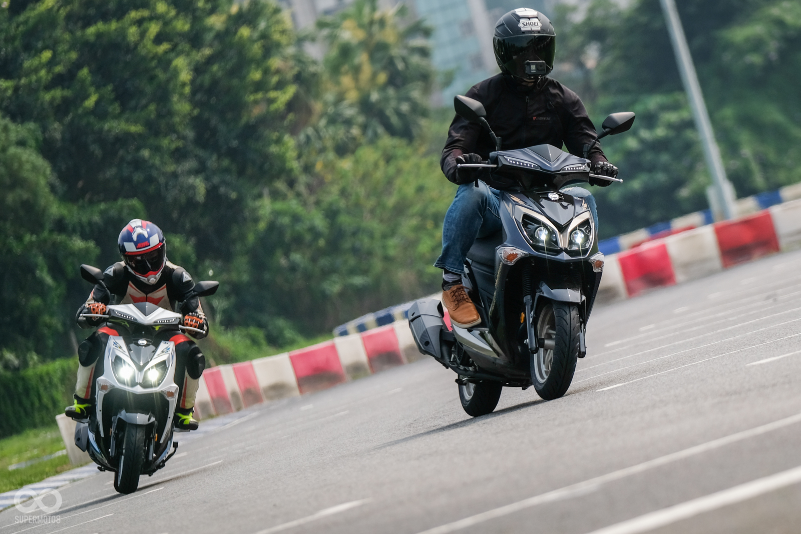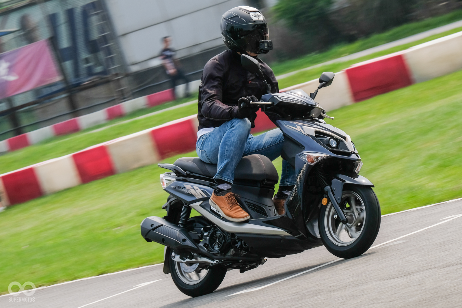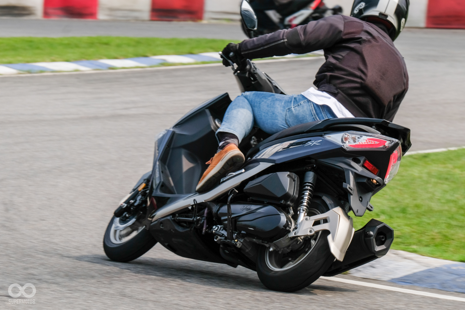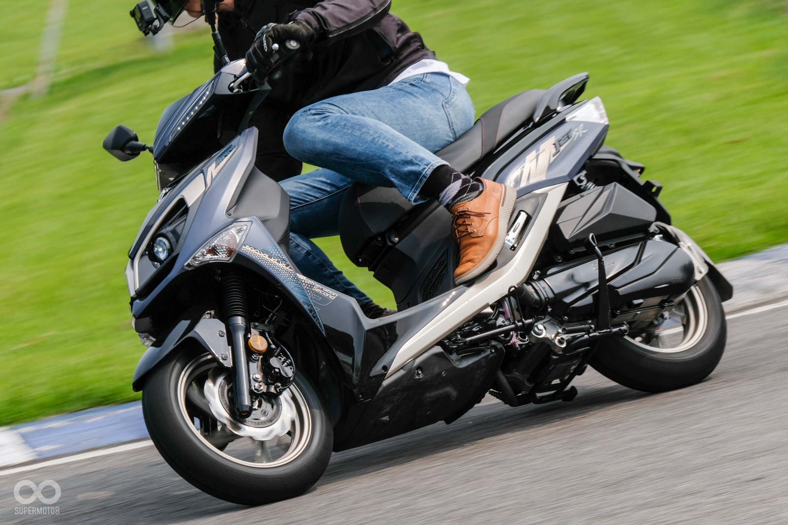 當熟悉車輛後提高速度進入一號彎,這是今天屬於高速的彎角,雖然懸吊還是略有晃動,但還是可以抓住車身給予騎士過彎信心,另外我們也深入暸解減重3公斤的秘密,JET SR換上全新輪框減重1.5公斤,讓靈活性遠勝於過往的12吋車款,另外JET SR再刁鑽的小彎中,也可以讓人感到同級大傾角帶來的優勢。