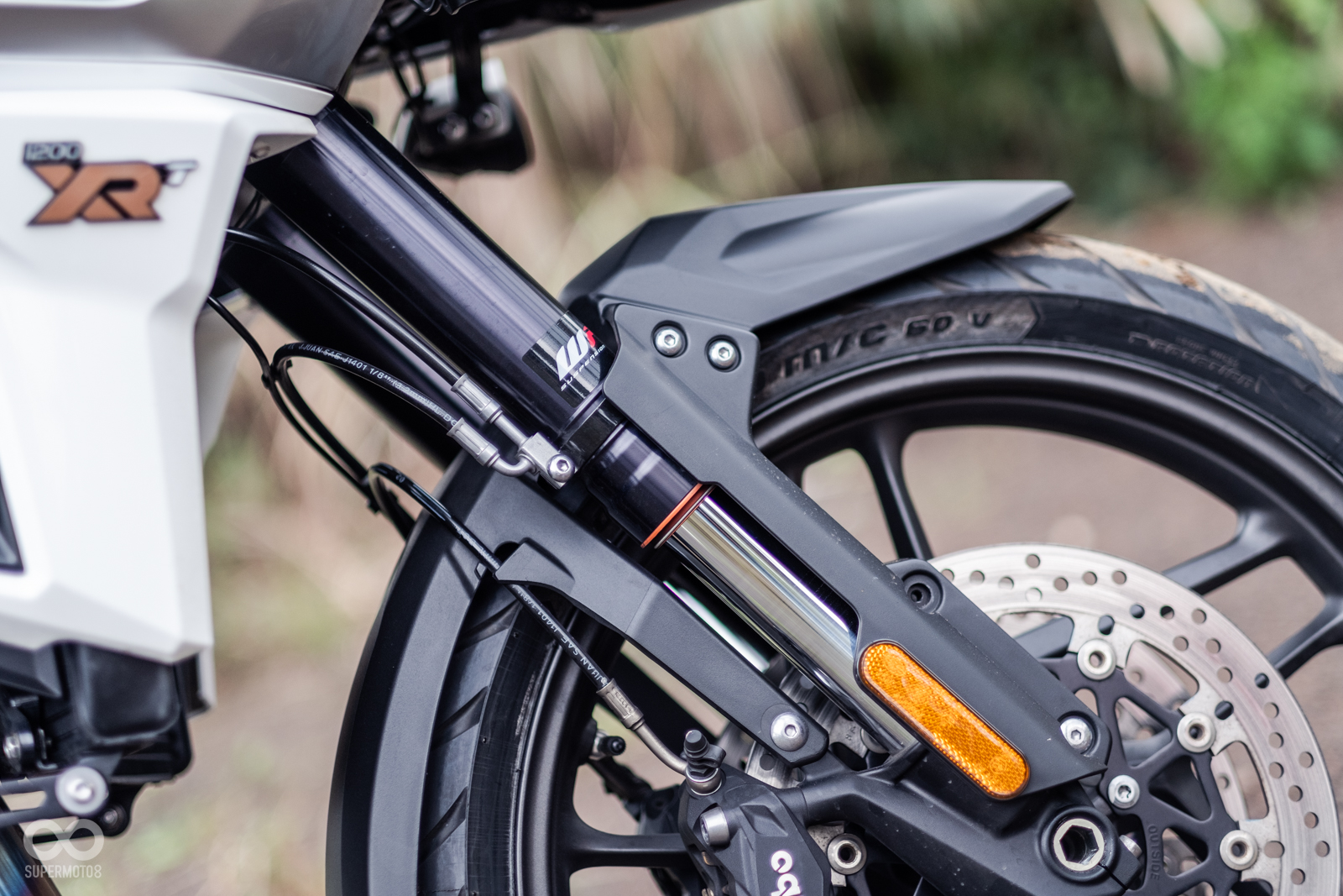 TRIUMPH TIGER 1200 XRt在前後懸吊部分,使用WP的前48mm倒立式全可調電子懸吊,後輪同樣為WP的單槍預載、阻尼可調電子懸吊,騎士同樣可以透過儀表上來調整不同的懸吊軟硬度,以便應對不同的路面狀況需求,或者單人、雙載的騎乘需求,只要坐在車上動動手指頭就能完成不同的設定,真的是超便利的設計。