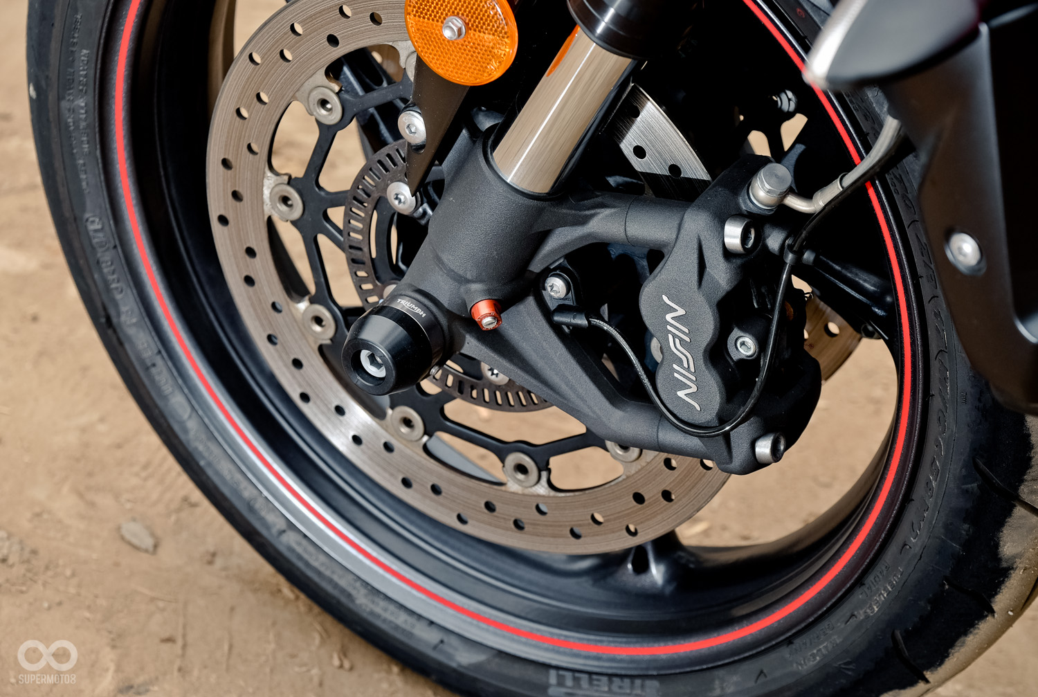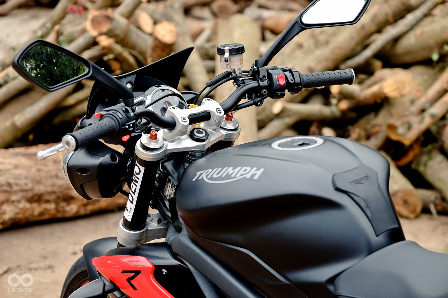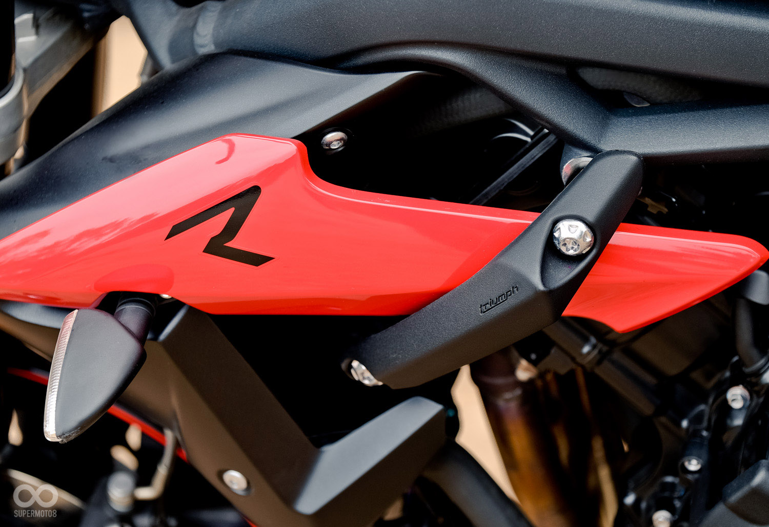 Street Triple 675 R所採用的配備可比擬競技用的改裝等級,懸吊部分前後採用KYB製品,且前後懸吊的預載與阻尼都可調整,由於懸吊的設定較硬,座高比標準版低了4mm。制動則使用前NISSIN輻射對向四活塞卡鉗搭配ABS防鎖死煞車系統,後制動是BREMBO對向雙活塞卡鉗搭配ABS,前後皆使用金屬煞車油管。此外本次測試的車款選配ARROW排氣管,造型與原廠管如出一轍,另外一提自從排氣管從尾雙出改為側單出後,重量少了3.6kg。最後看到輪胎配上倍耐力DIABLO ROSSOCORSA複合胎,從各項配備來看,Street Triple 675 R活脫是一輛擁有賽車靈魂的街車。