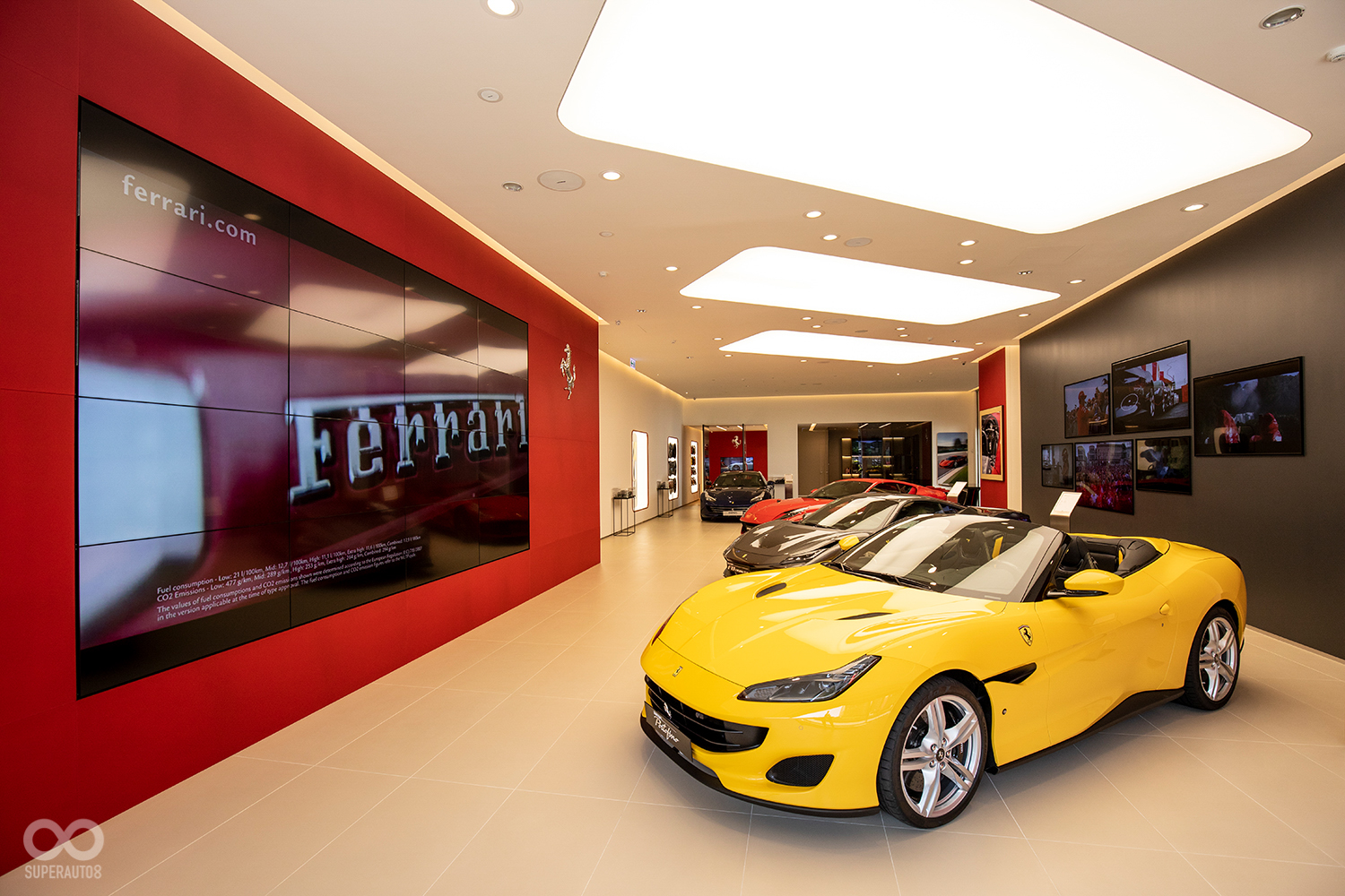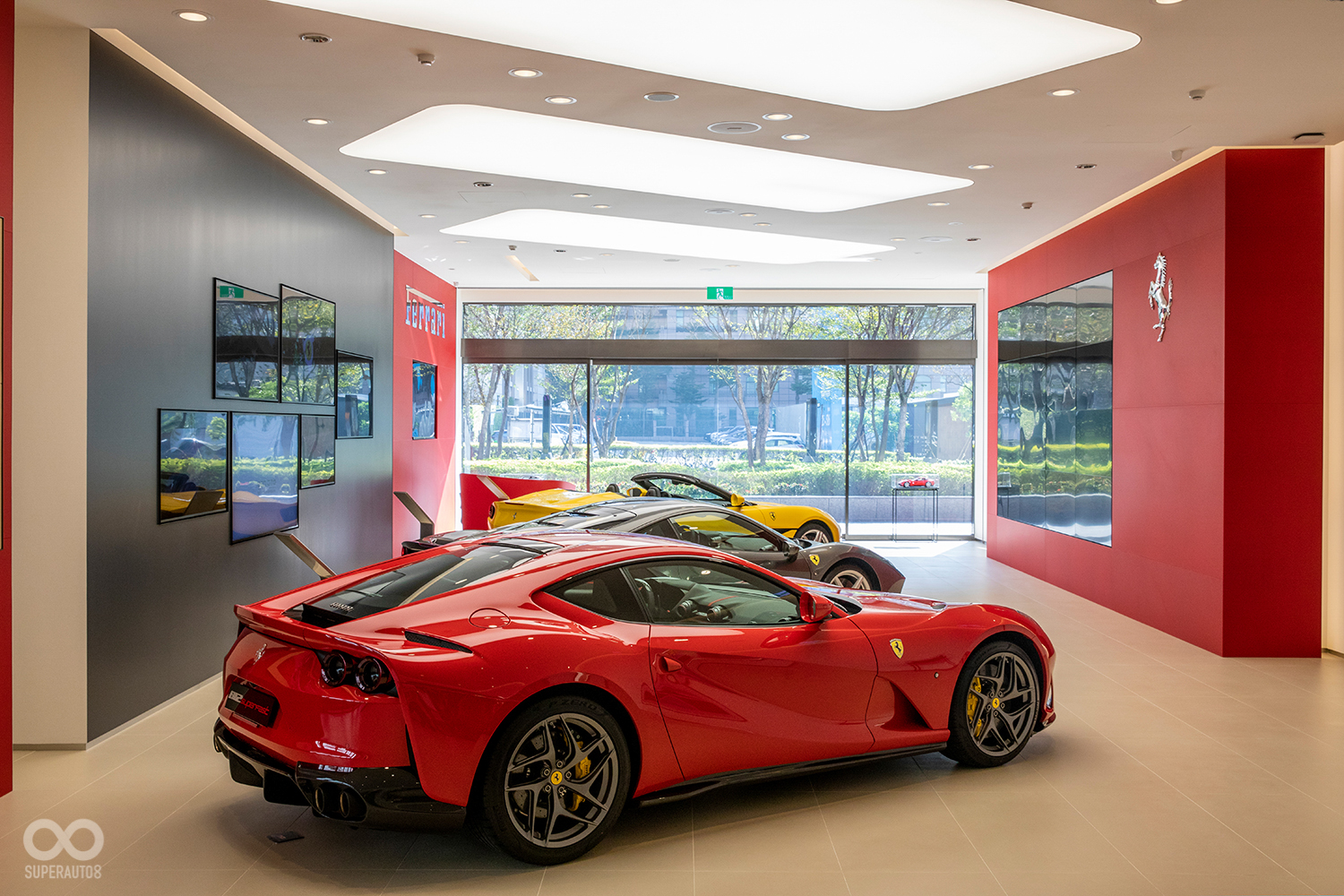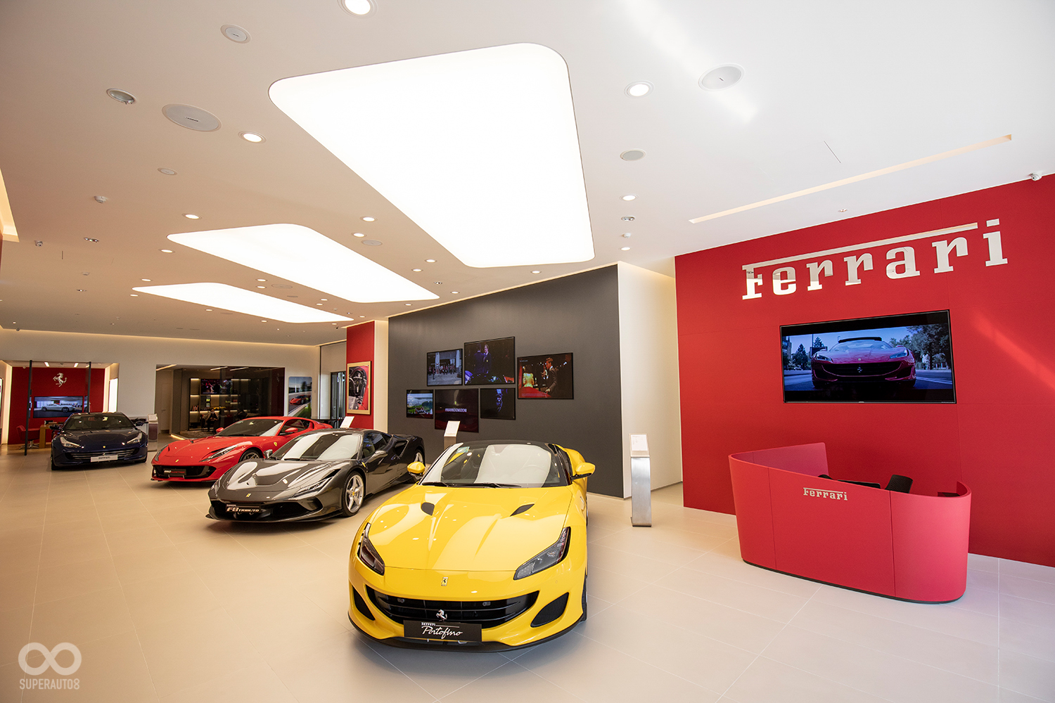 全新Ferrari法拉利臺中展示中心透過大面積LED影視牆與一字排開的紅鬃烈馬,一進門就可充分在義式奢華的氛圍中感受到躍馬品牌獨一無二的傳奇故事與經典元素。