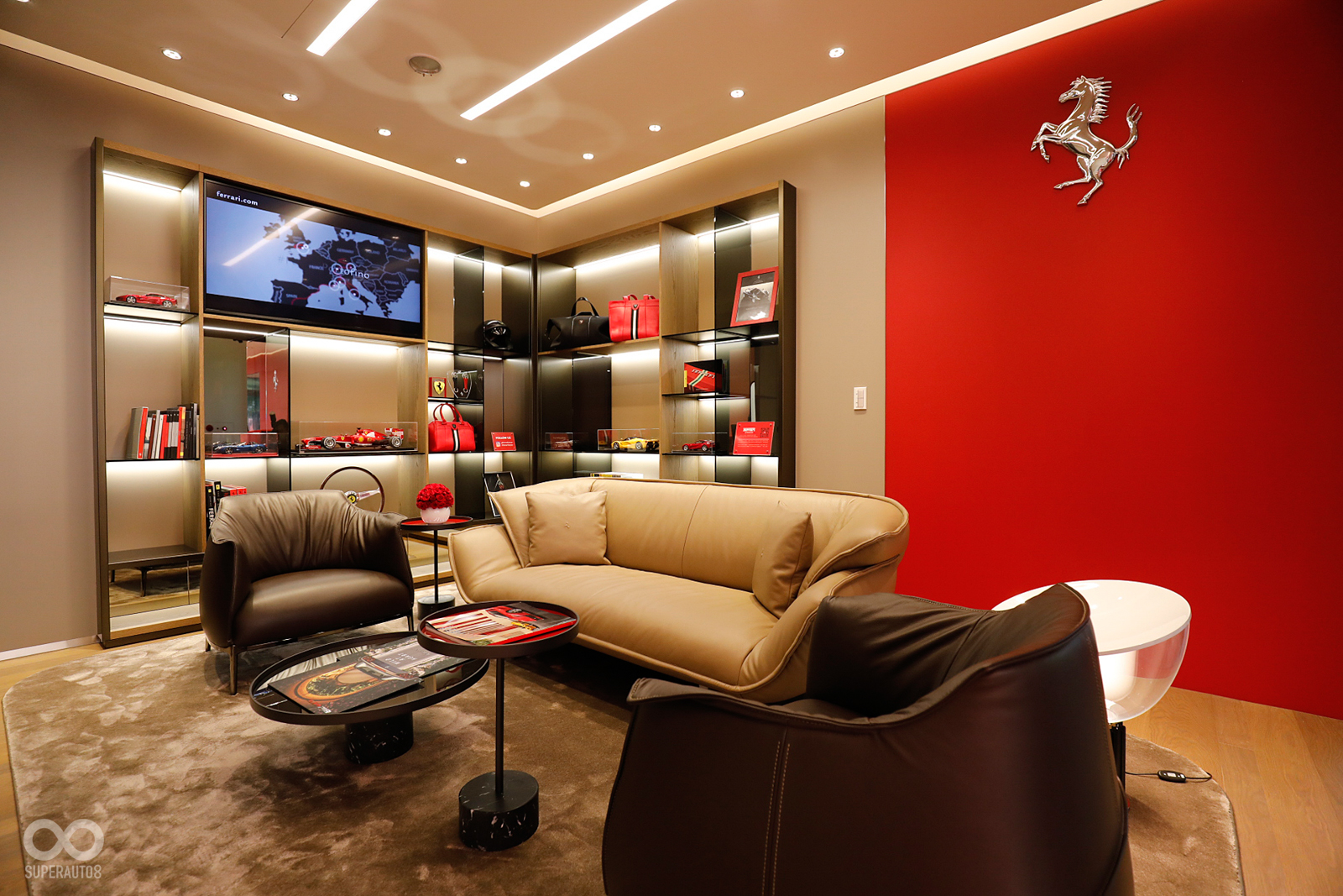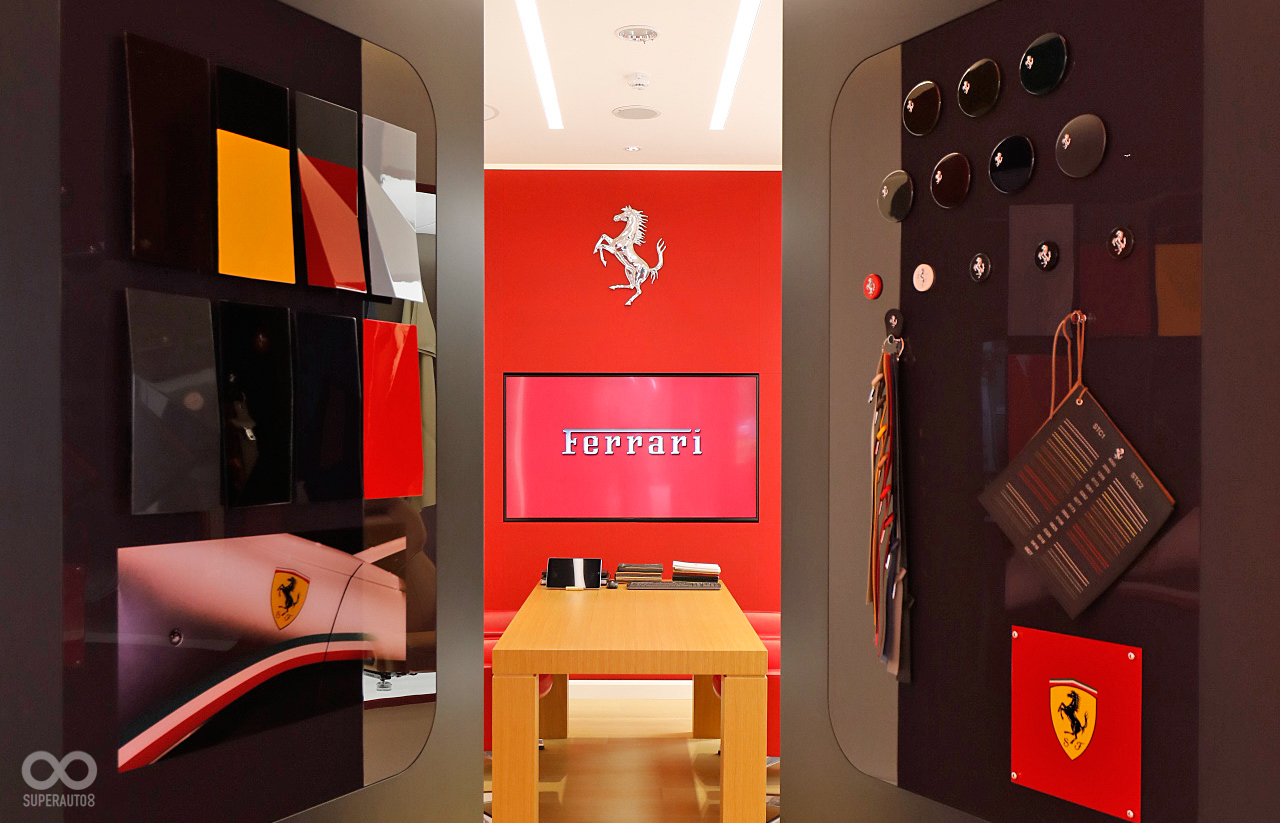 而在豐富多樣的選用配件陳列區中,不論是輪圈、烤漆色板或是頂級皮革樣品,賞車貴賓均可在這構築心中紅鬃烈馬的獨享空間中,將構思轉為一輛專屬於自己的Ferrari法拉利。而充滿義式美學與奢華感受的貴賓休憩區也換上全球知名手工義大利傢俱品牌Poltrona Frau和Cassina的頂級皮革沙發,以優雅的義式設計格,讓所有躍馬貴賓均能享受賓至如歸的極致賞車體驗。