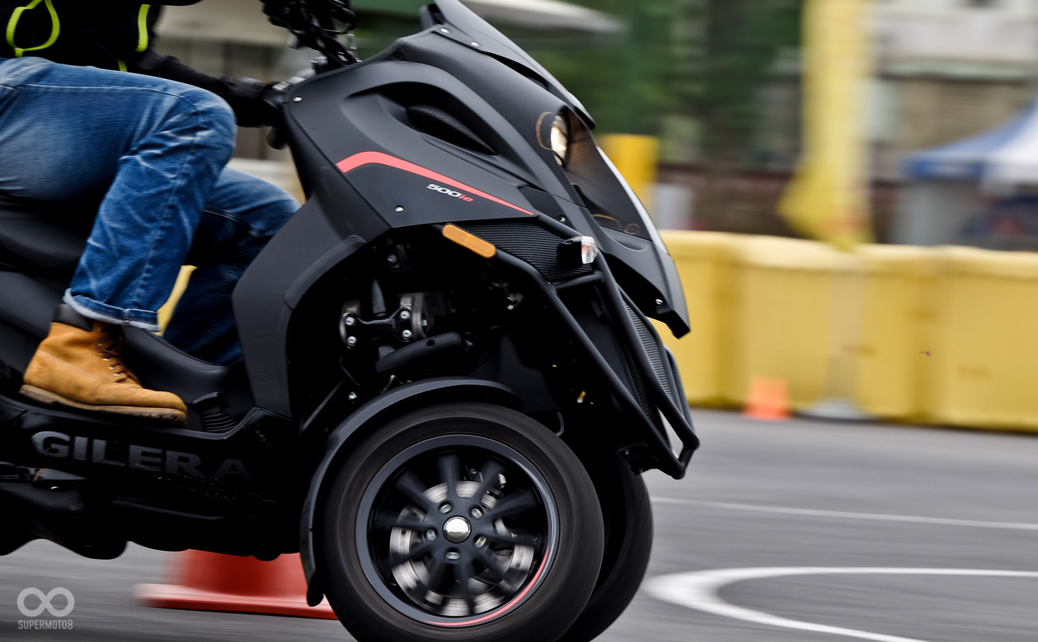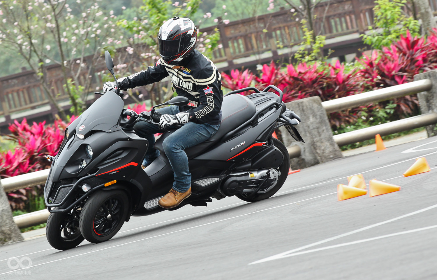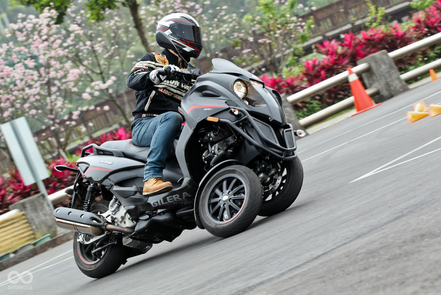 Gilera Fuoco 500ie與我們過去試乘過的3D-350有著截然不同的三輪機構,在進行場內繞錐時Gilera Fuoco 500ie並不需要像3D-350刻意使用逆操舵,即可輕鬆入彎,甚至在連續S路線也非常輕鬆自在。這對於由二輪跳至三輪的騎士幾乎到達無痛升級的地步。當然如果你硬要和二輪的靈活度相比三輪絕對還是無法比擬。