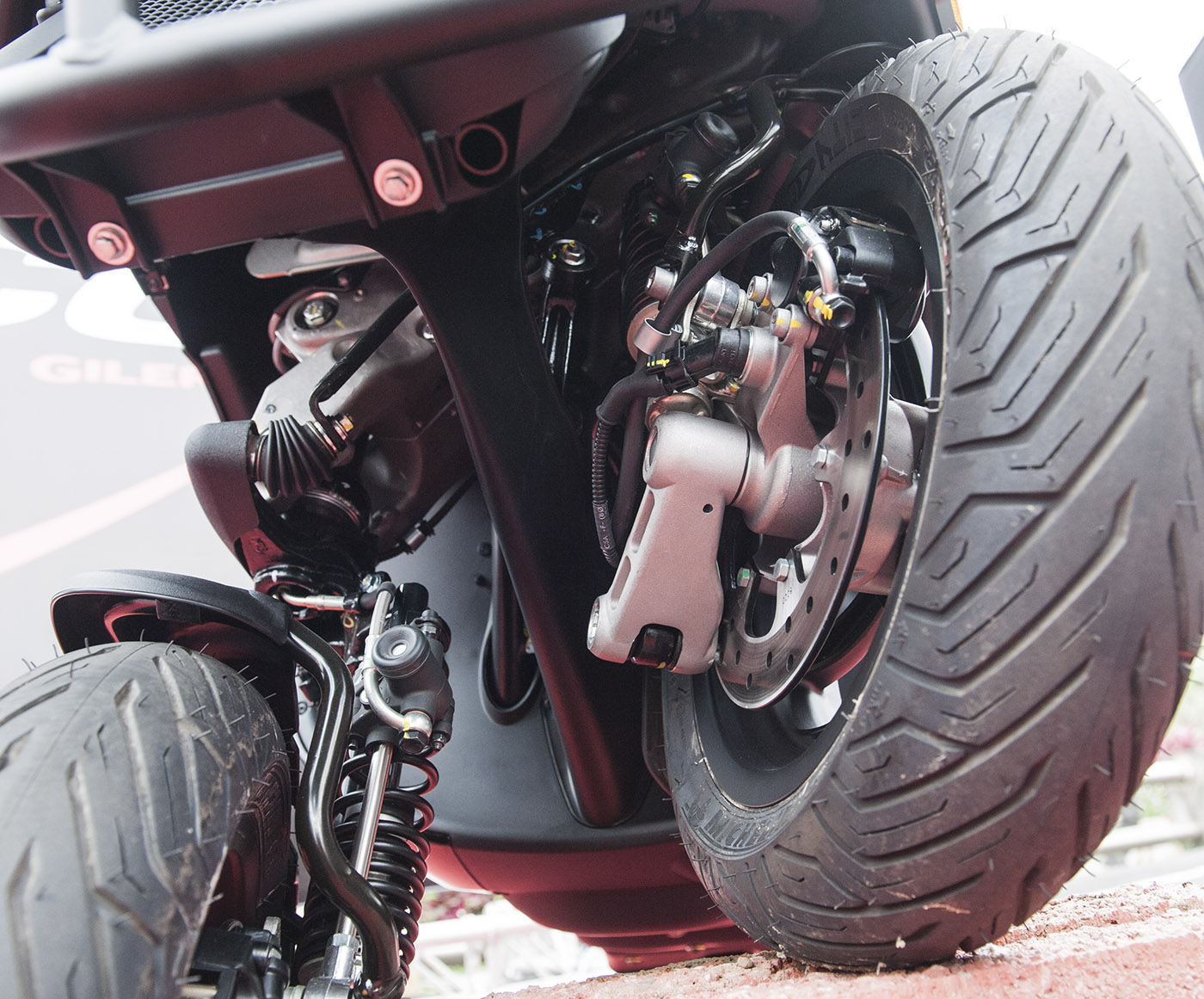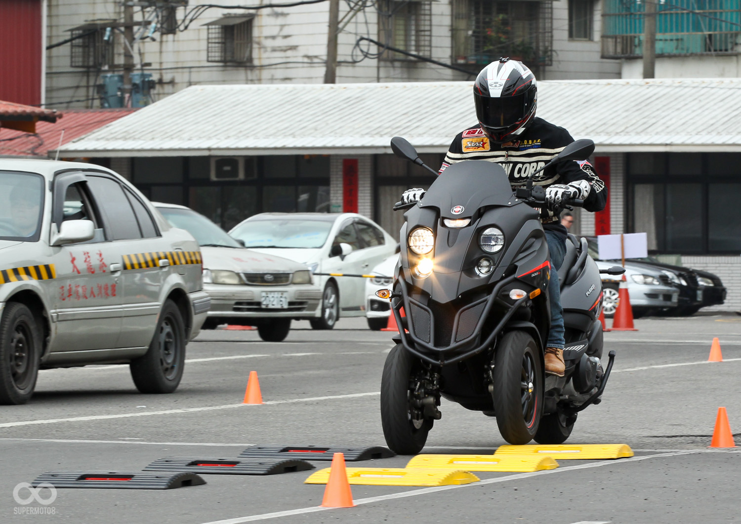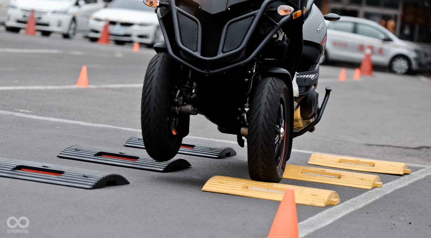 最令我們印象深刻的是當Gilera Fuoco 500ie行駛過場內的凹凸障礙區,這與我們過往騎乘二輪車經過高架伸縮縫有著截然不同的體驗,連續而來的高地起伏路面帶給我們是如履平地般的穩定感受,即使將車速提高通過車把依然不震手,這樣體驗直到試乘結束後還令人難以忘懷。