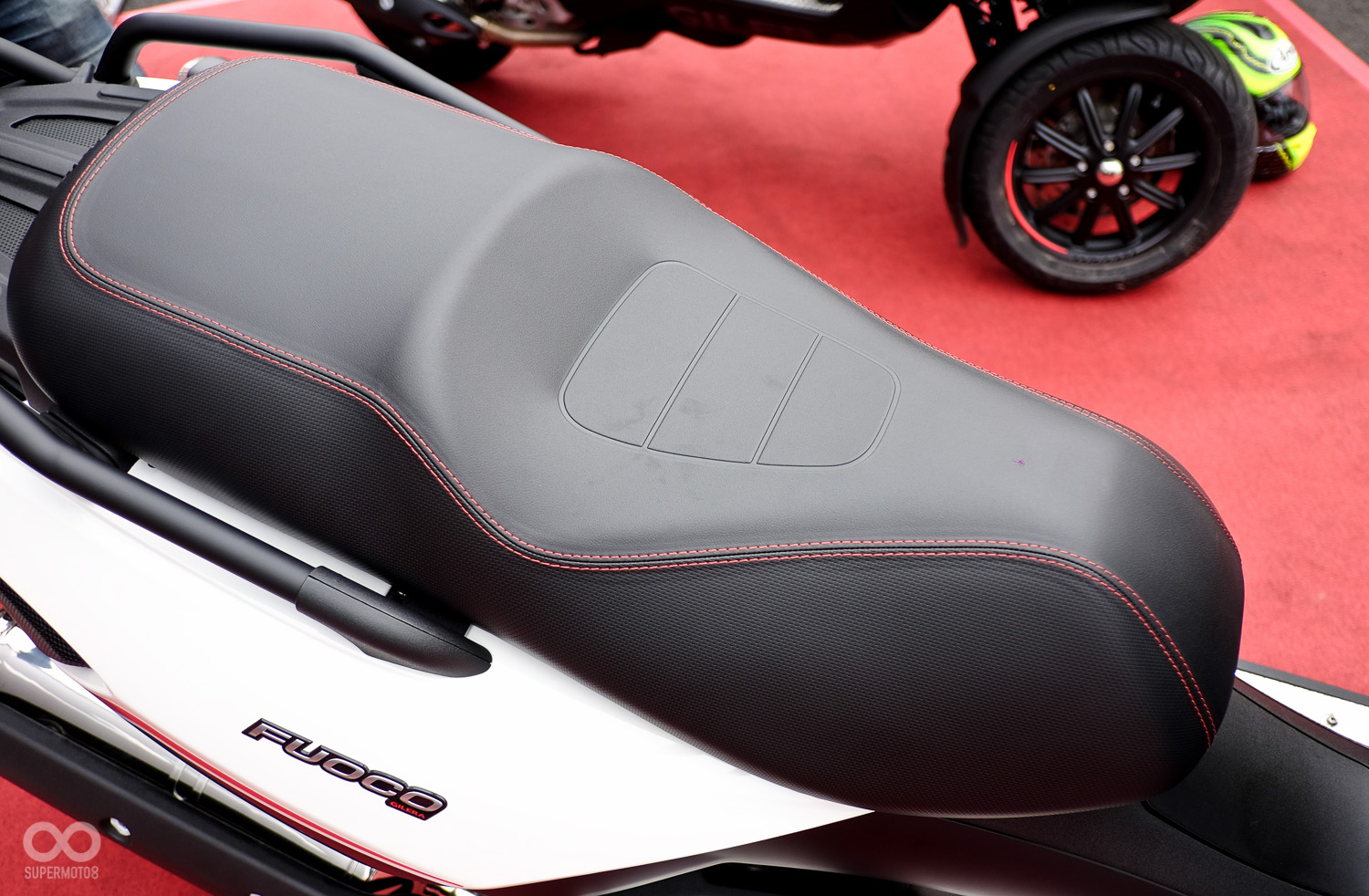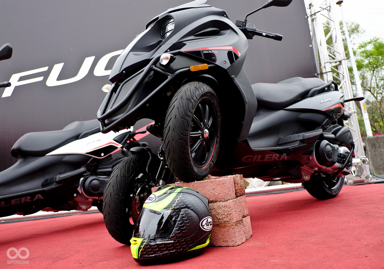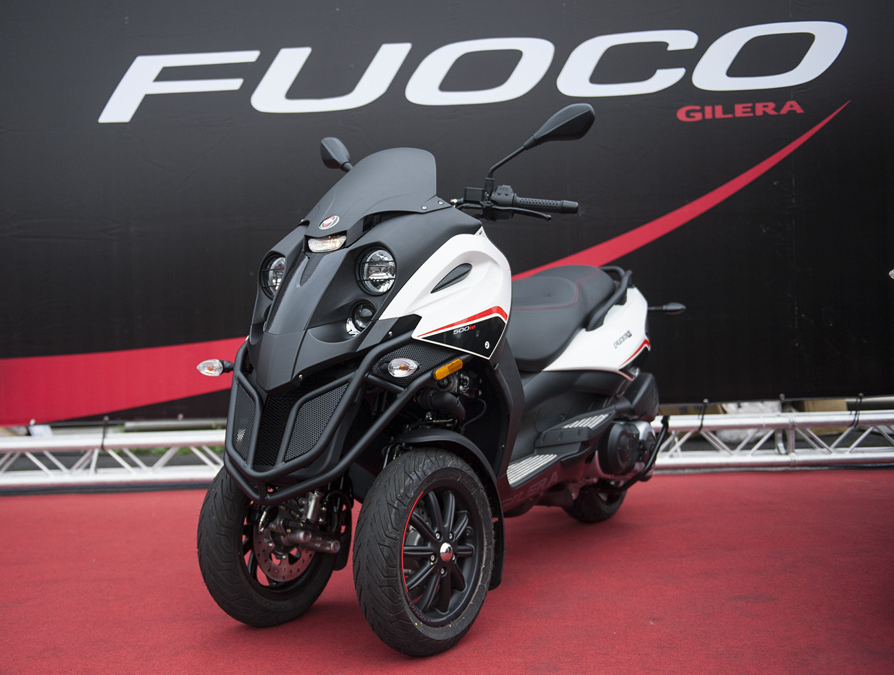 發表會場 Gilera Fuoco 500ie 以誇張的左右輪高低差置放,幅度足以容納一頂全罩安全帽,展現其寬廣的運動空間。寬厚的車頭造型搭配上四眼頭燈的設計,散發著怪獸般的凶惡感。