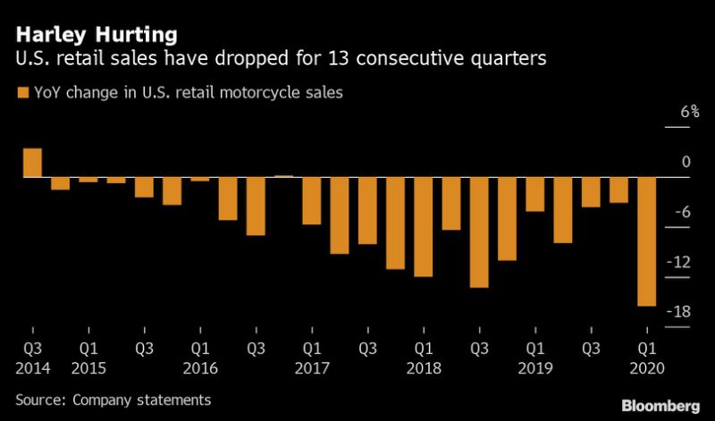 在2012年時,Harley-Davidson的銷售還可以維持在160,400輛,之後連續都是下跌的狀態長達7年,2019年全球只有125,995輛,下降了22%之多,而2020年迎來了新冠肺炎這個黑天鵝,銷售量更式銳減,本就不好的表現更是雪上加霜,銷售對比2019年第一季下跌了18%,而利潤也從原本的1.28億美金下跌至7000萬美金。