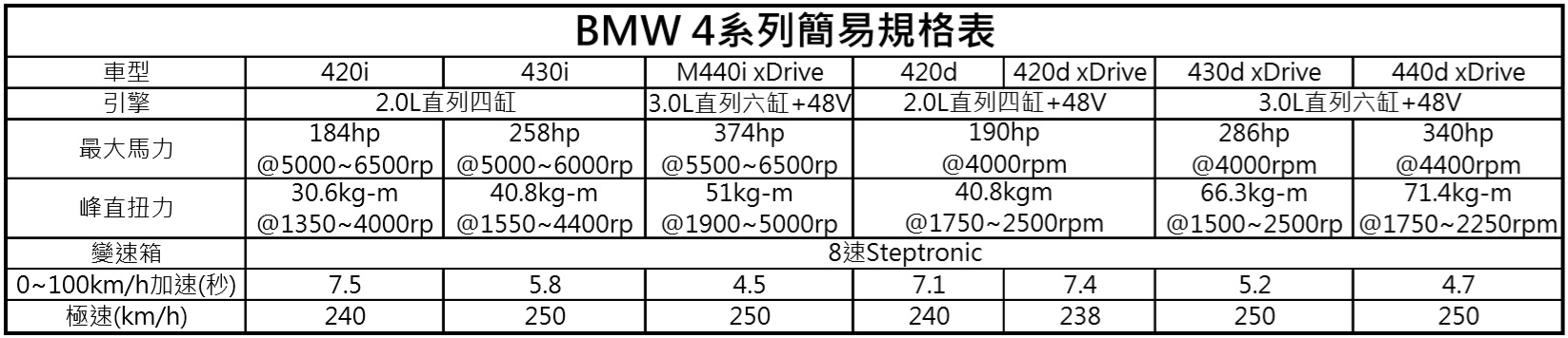而前方的大型水箱護罩除了視覺衝擊之外,更重要的是提供新鮮的空氣到動力心臟當中,首波發表的車型有420i、430i、M440i xDrive、420d以及420d xDrive,而明年三月還有會430d xDrive以及M440d xDrive兩款柴油六缸車型,相關的動力規格數據請見下表: