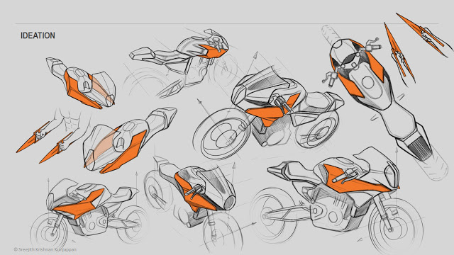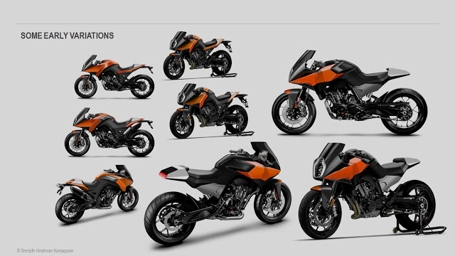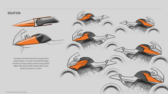 在車身側面的線條部分,Sreejith Krishnan Kunjappan以印度傳統的短劍「Katar」作為發想,這種有著三角形寬劍身、H型劍柄的短劍,巧妙的融入了這台790 Cafe Racer的車身側面,創造出非常銳利、動感的視覺,就好像是一位戰士拿著兩把Katar向前突刺一般充滿殺氣。